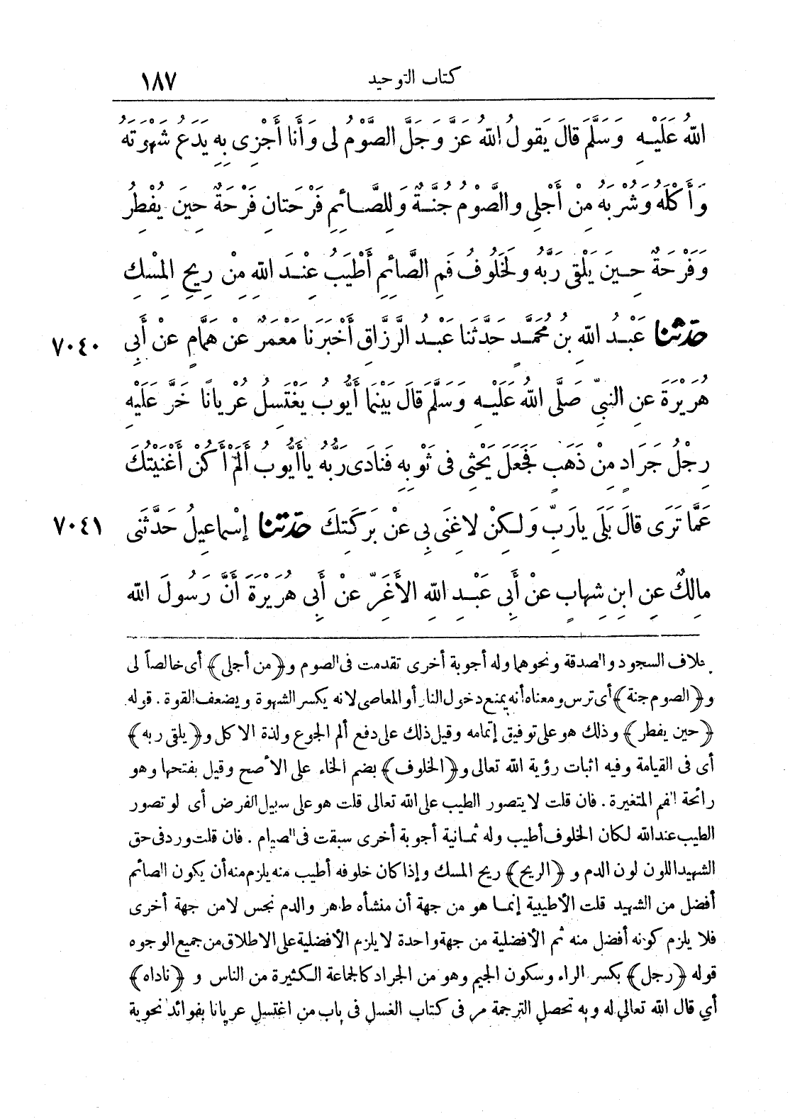 7040 - حَدَّثَنَا عَبْدُ اللَّهِ بْنُ مُحَمَّدٍ حَدَّثَنَا عَبْدُ الرَّزَّاقِ أَخْبَرَنَا مَعْمَرٌ عَنْ هَمَّامٍ عَنْ أَبِي هُرَيْرَةَ عَنْ النَّبِيِّ صَلَّى اللَّهُ عَلَيْهِ وَسَلَّمَ قَالَ بَيْنَمَا أَيُّوبُ يَغْتَسِلُ عُرْيَانًا خَرَّ عَلَيْهِ رِجْلُ جَرَادٍ مِنْ ذَهَبٍ فَجَعَلَ يَحْثِي فِي ثَوْبِهِ فَنَادَى رَبُّهُ يَا أَيُّوبُ أَلَمْ أَكُنْ أَغْنَيْتُكَ عَمَّا تَرَى قَالَ بَلَى يَا رَبِّ وَلَكِنْ لَا غِنَى بِي عَنْ بَرَكَتِكَ