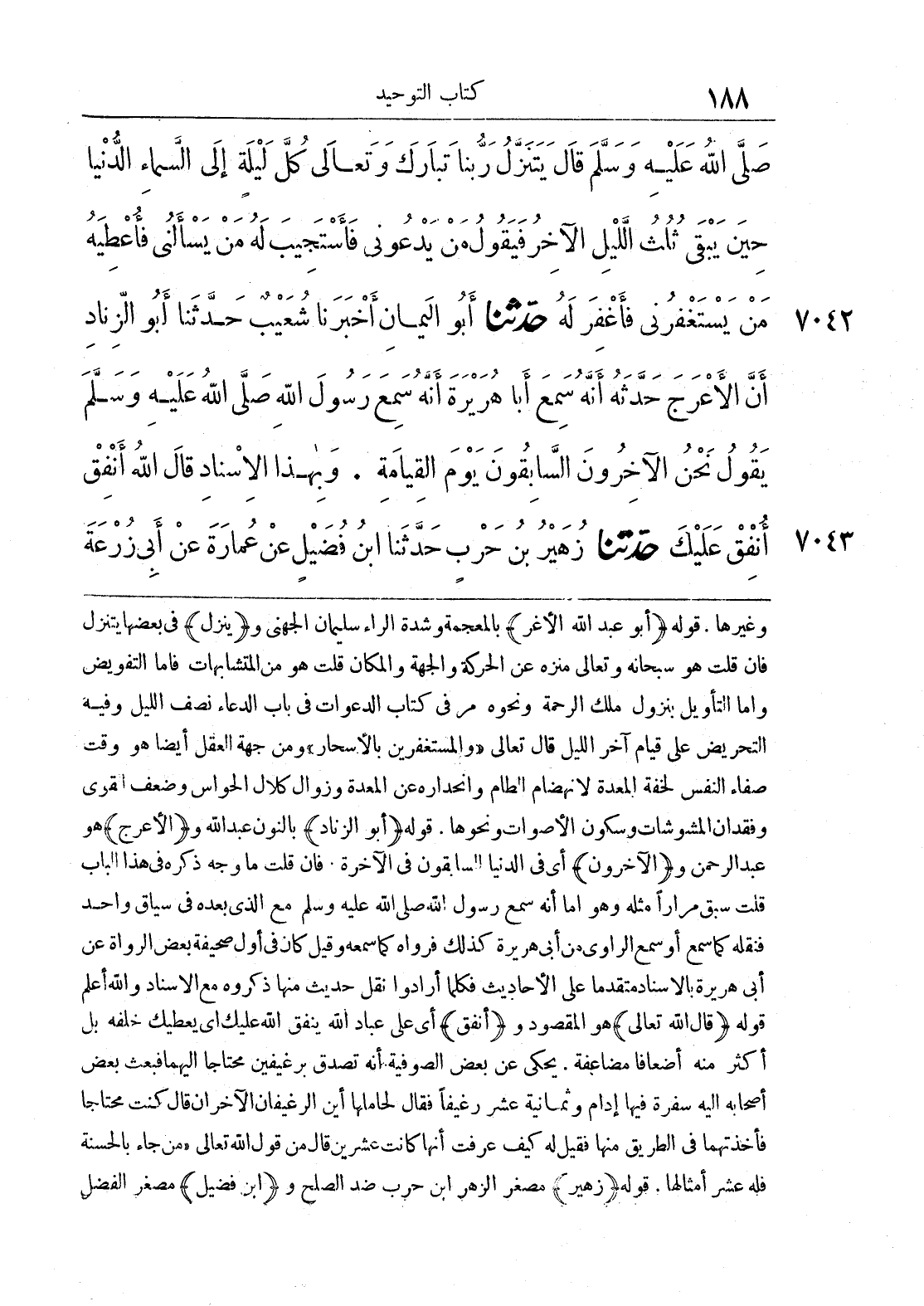 وغيرها. قوله {أبو عبد الله الأغر} بالمعجمة وشدة الراء سليمان الجهني و {ينزل} في بعضها يتنزل فإن قلت هو سبحانه وتعالى منزه عن الحركة والجهة والمكان قلت هو من المتشابهات فإما التفويض وإما التأويل بنزول ملك الرحمة ونحوه مر في كتاب الدعوات في باب الدعاء نصف الليل وفيه التحريض على قيام آخر الليل قال تعالى {والمستغفرين بالأسحار} ومن جهة العقل أيضا هو وقت صفاء النفس لخفة المعدة لانهضام الطعام وانحداره عن المعدة وزوال كلال الحواس وضعف القوى وفقدان المشوشات وسكون الأصوات ونحوها. قوله {أبو الزناد} بالنون عبد الله و {الأعرج} هو عبد الرحمن و {الآخرون} أي في الدنيا السابقون في الآخرة. فإن قلت ما وجه ذكره في هذا الباب قلت سبق مرارا مثله وهو إما أنه سمع رسول الله صلى الله عليه وسلم مع الذي بعده في سياق واحد فنقله كاسمع أو سمع الراوي من أبي هريرة كذلك فرواه كما سمعه وقيل كان في أول صحيفة بعض الرواة عن أبي هريرة بالإسناد متقدما على الأحاديث فكلما أرادوا نقل حديث منها ذكروه مع الإسناد والله أعلم، قوله {قال الله تعالى} هو المقصود و {أنفق} أي على عباد الله ينفق الله عليك أي يعطيك خلفه بل أكثر منه أضعافا مضاعفة. يحكى عن بعض الصوفية أنه تصدق برغيفين محتاجا إليهما فبعث بعض أصحابه إليه سفرة فيها إدام وثمانية عشر رغيفا فقال لحاملها أين الرغيفان الآخران قال كنت محتاجا فأخذتهما في الطريق منها فقيل له كيف عرفت أنها كانت عشرين قال من قول الله تعالى {من جاء بالحسنة فله عشر أمثالها} قوله {زهير} مصغر الزهر ابن حرب ضد الصلح و {ابن فضيل} مصغر الفضل