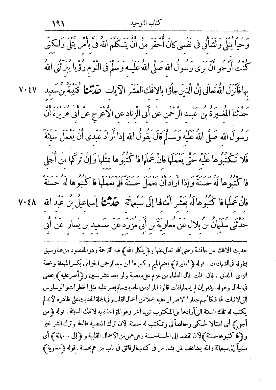 7047 - حَدَّثَنَا قُتَيْبَةُ بْنُ سَعِيدٍ حَدَّثَنَا الْمُغِيرَةُ بْنُ عَبْدِ الرَّحْمَنِ عَنْ أَبِي الزِّنَادِ عَنْ الْأَعْرَجِ عَنْ أَبِي هُرَيْرَةَ أَنَّ رَسُولَ اللَّهِ صَلَّى اللَّهُ عَلَيْهِ وَسَلَّمَ قَالَ يَقُولُ اللَّهُ إِذَا أَرَادَ عَبْدِي أَنْ يَعْمَلَ سَيِّئَةً فَلَا تَكْتُبُوهَا عَلَيْهِ حَتَّى يَعْمَلَهَا فَإِنْ عَمِلَهَا فَاكْتُبُوهَا بِمِثْلِهَا وَإِنْ تَرَكَهَا مِنْ أَجْلِي فَاكْتُبُوهَا لَهُ حَسَنَةً وَإِذَا أَرَادَ أَنْ يَعْمَلَ حَسَنَةً فَلَمْ يَعْمَلْهَا فَاكْتُبُوهَا لَهُ حَسَنَةً فَإِنْ عَمِلَهَا فَاكْتُبُوهَا لَهُ بِعَشْرِ أَمْثَالِهَا إِلَى سَبْعِ مِائَةِ ضِعْفٍ