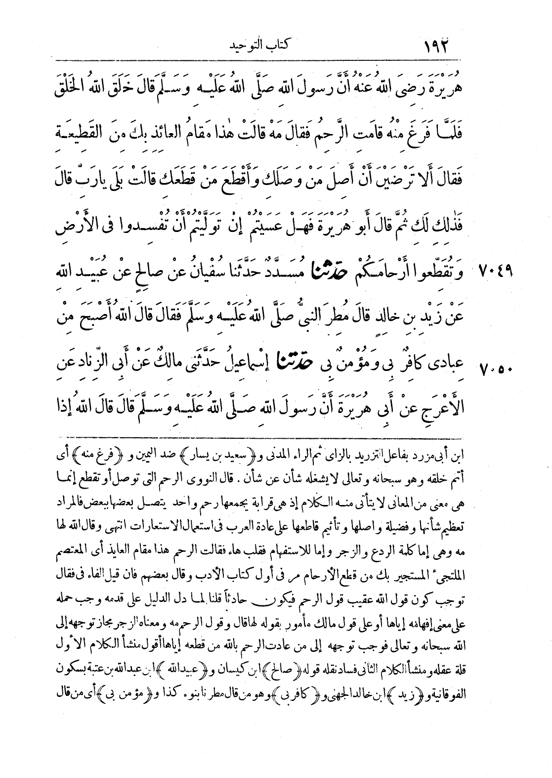 7049 - حَدَّثَنَا مُسَدَّدٌ حَدَّثَنَا سُفْيَانُ عَنْ صَالِحٍ عَنْ عُبَيْدِ اللَّهِ عَنْ زَيْدِ بْنِ خَالِدٍ قَالَ مُطِرَ النَّبِيُّ صَلَّى اللَّهُ عَلَيْهِ وَسَلَّمَ فَقَالَ قَالَ اللَّهُ أَصْبَحَ مِنْ عِبَادِي كَافِرٌ بِي وَمُؤْمِنٌ بِي