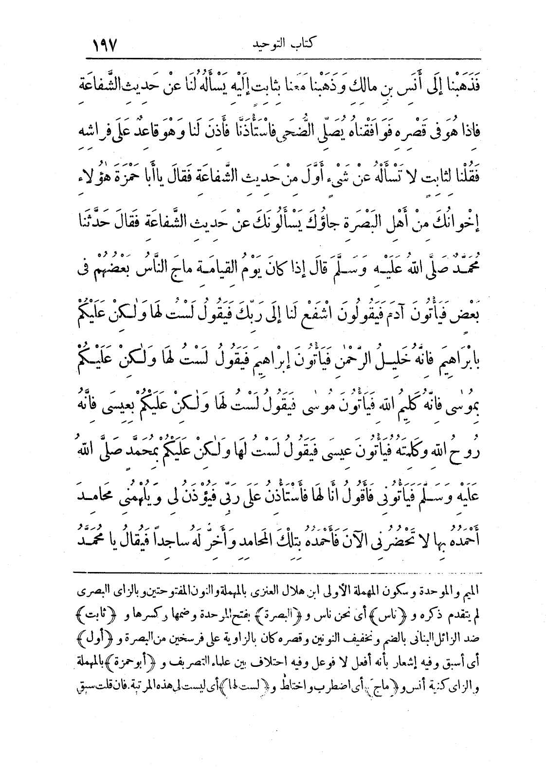 فَذَهَبْنَا إِلَى أَنَسِ بْنِ مَالِكٍ وَذَهَبْنَا مَعَنَا بِثَابِتٍ الْبُنَانِيِّ إِلَيْهِ يَسْأَلُهُ لَنَا عَنْ حَدِيثِ الشَّفَاعَةِ فَإِذَا هُوَ فِي قَصْرِهِ فَوَافَقْنَاهُ يُصَلِّي الضُّحَى فَاسْتَاذَنَّا فَأَذِنَ لَنَا وَهُوَ قَاعِدٌ عَلَى فِرَاشِهِ فَقُلْنَا لِثَابِتٍ لَا تَسْأَلْهُ عَنْ شَيْءٍ أَوَّلَ مِنْ حَدِيثِ الشَّفَاعَةِ فَقَالَ يَا أَبَا حَمْزَةَ هَؤُلَاءِ إِخْوَانُكَ مِنْ أَهْلِ الْبَصْرَةِ جَاءُوكَ يَسْأَلُونَكَ عَنْ حَدِيثِ الشَّفَاعَةِ فَقَالَ حَدَّثَنَا مُحَمَّدٌ صَلَّى اللَّهُ عَلَيْهِ وَسَلَّمَ قَالَ إِذَا كَانَ يَوْمُ الْقِيَامَةِ مَاجَ النَّاسُ بَعْضُهُمْ فِي بَعْضٍ فَيَاتُونَ آدَمَ فَيَقُولُونَ اشْفَعْ لَنَا إِلَى رَبِّكَ فَيَقُولُ لَسْتُ لَهَا وَلَكِنْ عَلَيْكُمْ بِإِبْرَاهِيمَ فَإِنَّهُ خَلِيلُ الرَّحْمَنِ فَيَاتُونَ إِبْرَاهِيمَ فَيَقُولُ لَسْتُ لَهَا وَلَكِنْ عَلَيْكُمْ بِمُوسَى فَإِنَّهُ كَلِيمُ اللَّهِ فَيَاتُونَ مُوسَى فَيَقُولُ لَسْتُ لَهَا وَلَكِنْ عَلَيْكُمْ بِعِيسَى فَإِنَّهُ رُوحُ اللَّهِ وَكَلِمَتُهُ فَيَاتُونَ عِيسَى فَيَقُولُ لَسْتُ لَهَا وَلَكِنْ عَلَيْكُمْ بِمُحَمَّدٍ صَلَّى اللَّهُ عَلَيْهِ وَسَلَّمَ فَيَاتُونِي فَأَقُولُ أَنَا لَهَا فَأَسْتَاذِنُ عَلَى رَبِّي فَيُؤْذَنُ لِي وَيُلْهِمُنِي مَحَامِدَ أَحْمَدُهُ بِهَا لَا تَحْضُرُنِي الْآنَ فَأَحْمَدُهُ بِتِلْكَ الْمَحَامِدِ وَأَخِرُّ لَهُ سَاجِدًا فَيَقُولُ يَا مُحَمَّدُ