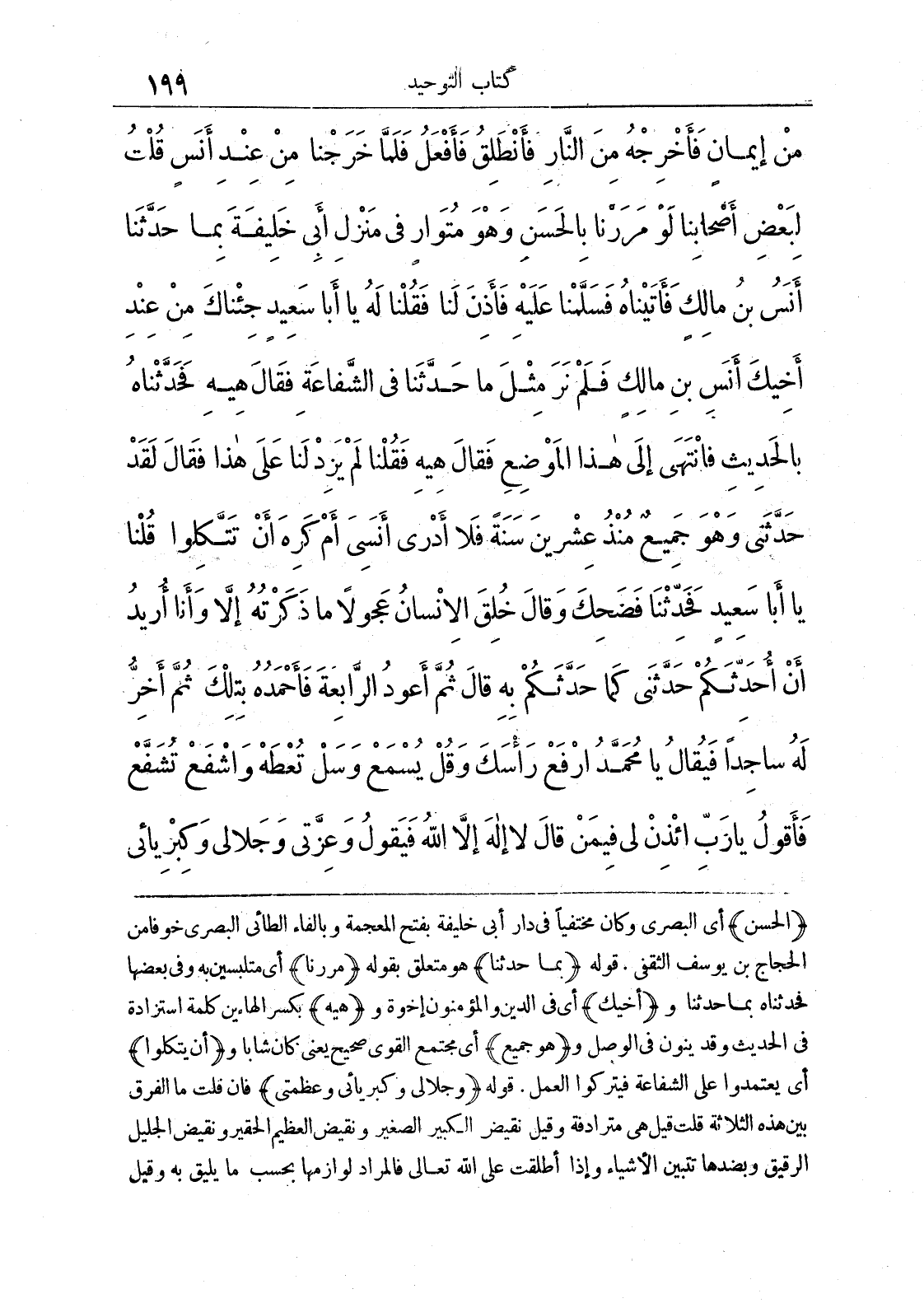 مِنْ إِيمَانٍ فَأَخْرِجْهُ مِنْ النَّارِ فَأَنْطَلِقُ فَأَفْعَلُ فَلَمَّا خَرَجْنَا مِنْ عِنْدِ أَنَسٍ قُلْتُ لِبَعْضِ أَصْحَابِنَا لَوْ مَرَرْنَا بِالْحَسَنِ وَهُوَ مُتَوَارٍ فِي مَنْزِلِ أَبِي خَلِيفَةَ فَحَدَّثْنَاهُ بِمَا حَدَّثَنَا أَنَسُ بْنُ مَالِكٍ فَأَتَيْنَاهُ فَسَلَّمْنَا عَلَيْهِ فَأَذِنَ لَنَا فَقُلْنَا لَهُ يَا أَبَا سَعِيدٍ جِئْنَاكَ مِنْ عِنْدِ أَخِيكَ أَنَسِ بْنِ مَالِكٍ فَلَمْ نَرَ مِثْلَ مَا حَدَّثَنَا فِي الشَّفَاعَةِ فَقَالَ هِيهْ فَحَدَّثْنَاهُ بِالْحَدِيثِ فَانْتَهَى إِلَى هَذَا الْمَوْضِعِ فَقَالَ هِيهْ فَقُلْنَا لَمْ يَزِدْ لَنَا عَلَى هَذَا فَقَالَ لَقَدْ حَدَّثَنِي وَهُوَ جَمِيعٌ مُنْذُ عِشْرِينَ سَنَةً فَلَا أَدْرِي أَنَسِيَ أَمْ كَرِهَ أَنْ تَتَّكِلُوا قُلْنَا يَا أَبَا سَعِيدٍ فَحَدِّثْنَا فَضَحِكَ وَقَالَ خُلِقَ الْإِنْسَانُ عَجُولًا مَا ذَكَرْتُهُ إِلَّا وَأَنَا أُرِيدُ أَنْ أُحَدِّثَكُمْ حَدَّثَنِي كَمَا حَدَّثَكُمْ بِهِ قَالَ ثُمَّ أَعُودُ الرَّابِعَةَ فَأَحْمَدُهُ بِتِلْكَ الْمَحَامِدِ ثُمَّ أَخِرُّ لَهُ سَاجِدًا فَيُقَالُ يَا مُحَمَّدُ ارْفَعْ رَاسَكَ وَقُلْ يُسْمَعْ وَسَلْ تُعْطَهْ وَاشْفَعْ تُشَفَّعْ فَأَقُولُ يَا رَبِّ ائْذَنْ لِي فِيمَنْ قَالَ لَا إِلَهَ إِلَّا اللَّهُ فَيَقُولُ وَعِزَّتِي وَجَلَالِي وَكِبْرِيَائِي