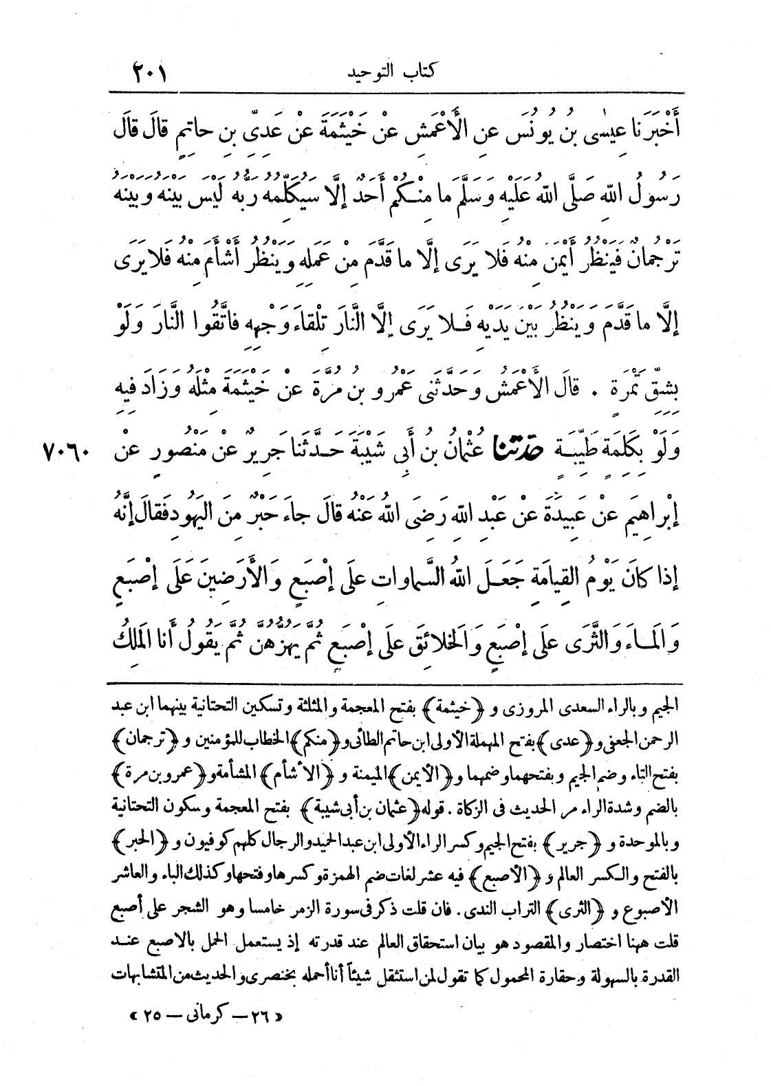 الجيم وبالراء السعدي المروزي و {خيثمة} بفتح المعجمة والمثلثة وتسكين التحتانية بينهما ابن عبد الرحمن الجعفي و {عدي} بفتح المهملة الأولى ابن حاتم الطائي و {منكم} الخطاب للمؤمنين و {ترجمان} بفتح التاء والجيم وبفتحهما وضمهما و {الأيمن} الميمنة و {الأشأم} المشأمة و {عمرو بن مرة} بالضم وشدة الراء مر في الزكاة. قوله {عثمان بن أبي شيبة} بفتح المعجمة وسكون التحتانية وبالموحدة و {جرير} بفتح الجيم وكسر الراء الأولى ابن عبد الحميد والرجال كلهم كوفيون و {الحبر} بالفتح والكسر العالم و {الأصبع} فيه عشر لغات ضم الهمزة وكسرها وفتحها وكذلك الباء والعاشر الأصبوع و {الثرى} التراب الندي. فإن قلت ذكر في سورة الزمر خامسا وهو الشجر على أصبع قلت ههنا اختصار والمقصود هو بيان استحقاق العالم عند قدرته إذ يستعمل الحمل بالإصبع عند القدرة بالسهولة وحقارة المحمول كما تقول لمن استثقل شيئا أنا احمله بخنصري والحديث من المتشابهات