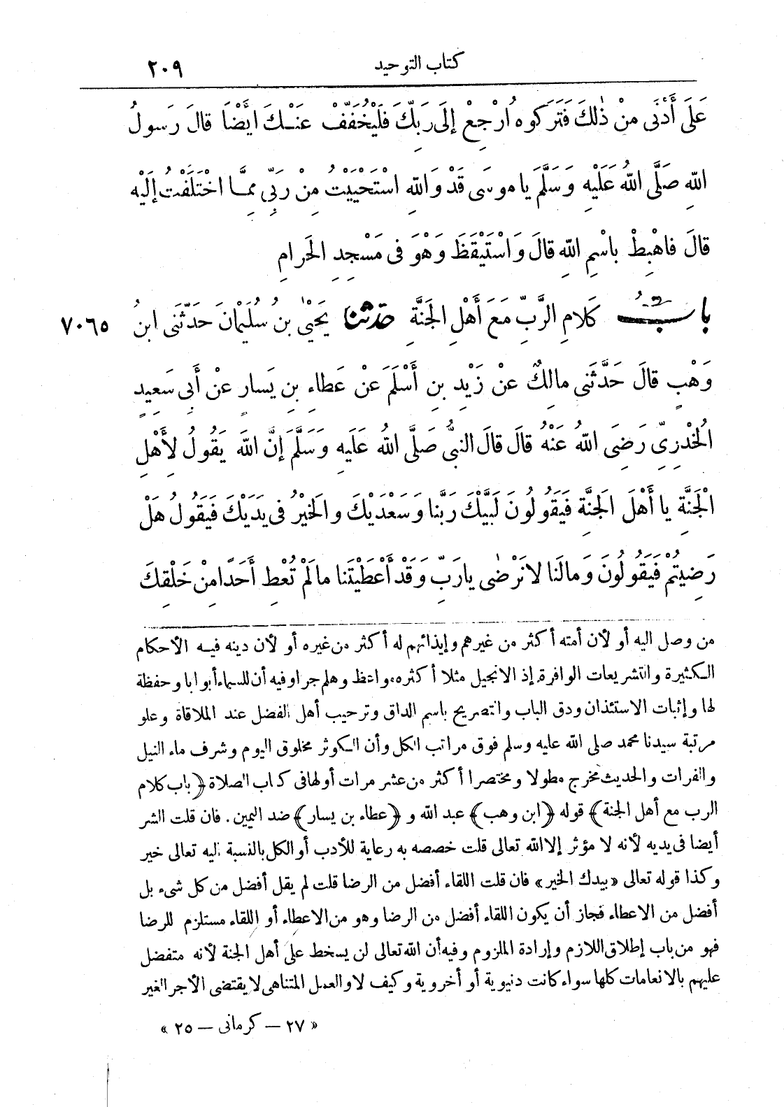 من وصل إليه أو لأن أمته أكثر من غيرهم وإيذائهم له أكثر من غيره أو لان دينه فيه الأحكام الكثيرة والتشريعات الوافرة إذ الإنجيل مثلا اكثره واعظ وهلم جرا وفيه أن للسماء أبوابا وحفظة لها وإثبات الاستئذان ودق الباب والتصريح باسم الداق وترحيب أهل الفضل عند الملاقاة وعلو مرتبة سيدنا محمد صلى الله عليه وسلم فوق مراتب الكل وأن الكوثر مخلوق اليوم وشرف ماء النيل والفرات والحديث مخرج مطولا ومختصرا أكثر من عشر مرات أولها في كتاب الصلاة، {باب كلام الرب مع أهل الجنة} قوله {ابن وهب} عبد الله و {عطاء بن يسار} ضد اليمين. فإن قلت الشر أيضا في يديه لأنه لا مؤثر إلا الله تعالى قلت خصصه به رعاية للأدب أو الكل بالنسبة إليه تعالى خير وكذا قوله تعالى "بيدك الخير" فإن قلت اللقاء أفضل من الرضا وهو من الإعطاء أو اللقاء مستلزم للرضا فهو من باب إطلاق اللازم وإرادة الملزوم وفيه أن الله تعالى لن يسخط على أهل الجنة لأنه متفضل عليهم بالإنعامات كلها سواء كانت دنيوية أو أخروية وكيف لا والعمل المتناهي لا يقتضي الأجر الغير