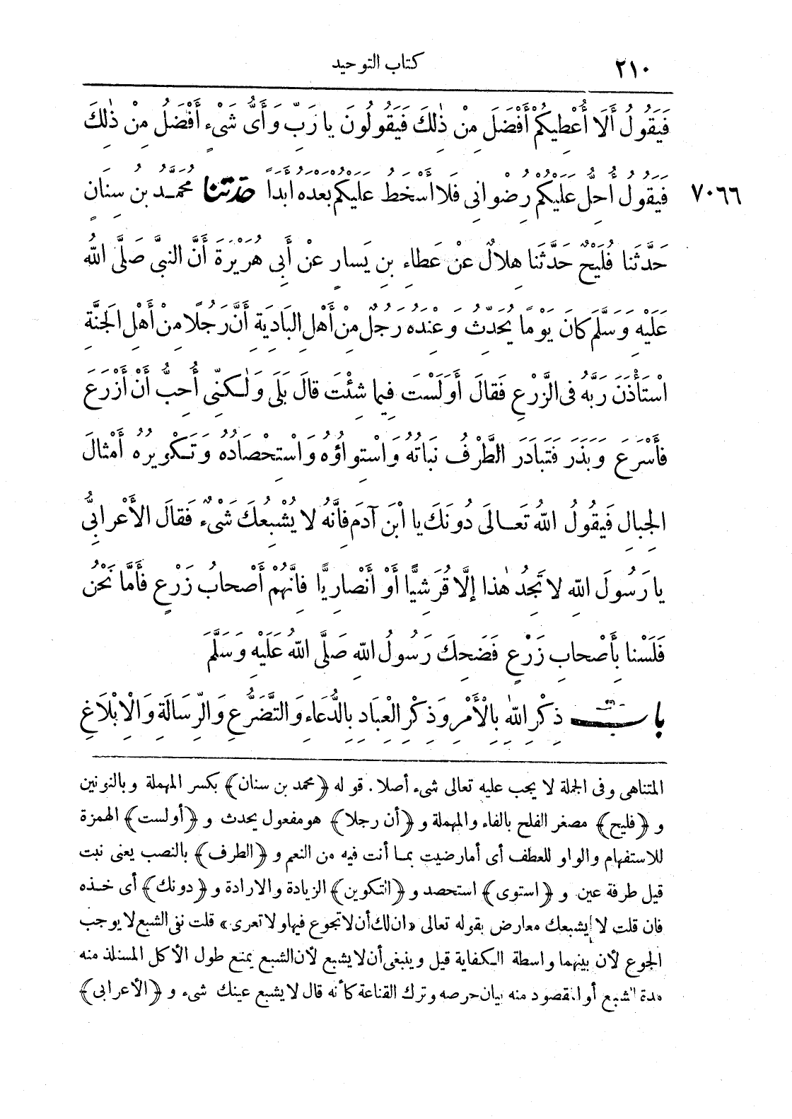 المتناهي وفي الجملة لا يجب عليه تعالى شيء أصلا، قوله {محمد بن سنان} بكسر المهملة وبالنونين و {فليح} مصغر الفلح بالفاء والمهملة و {أن رجلا} هو مفعول يحدث و {أولست} الهمزة للاستفهام والواو للعطف أي أما رضيت بما أنت فيه من النعم و {الطرف} بالنصب يني نبت قيل طرفة عين و {استوى} استحصد و {التكوين} الزيادة والإرادة و {دونك} أي خذه فإن قلت لا يشبعك معارض بقوله تعالى {إن لك أن لا تجوع فيها ولا تعرى} قلت نفي الشبع لا يوجب الجوع لأن بينهما واسطة الكفاية قيل وينبغي أن لا يشبع لأن الشبع يمنع طول الكل المستلذ منه مدة الشبع أو المقصود منه بيان حرصه وترك القناعة كأنه قال لا يشبع عينك شيء و {الأعرابي}