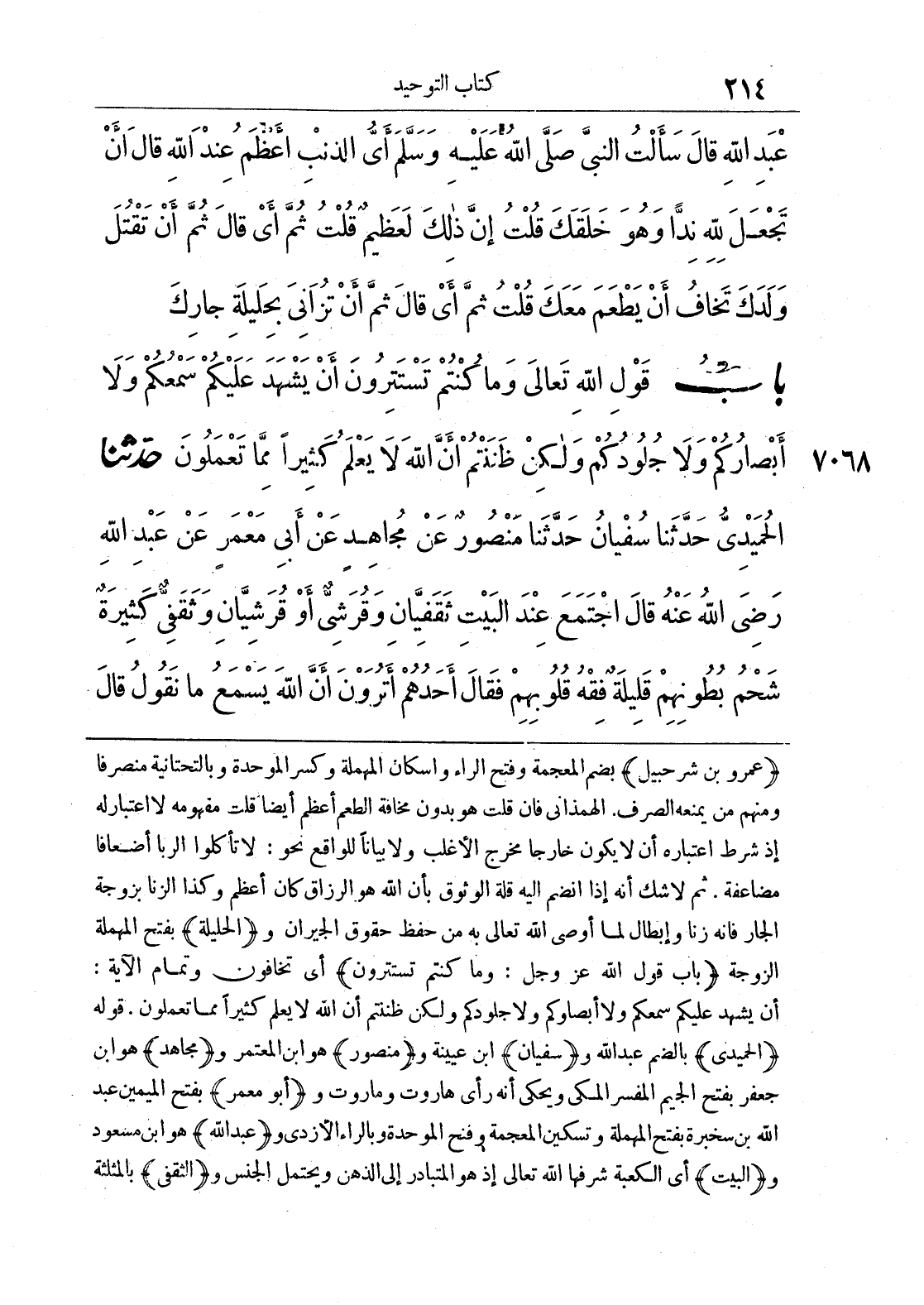 7068 - حَدَّثَنَا الْحُمَيْدِيُّ حَدَّثَنَا سُفْيَانُ حَدَّثَنَا مَنْصُورٌ عَنْ مُجَاهِدٍ عَنْ أَبِي مَعْمَرٍ عَنْ عَبْدِ اللَّهِ رَضِيَ اللَّهُ عَنْهُ قَالَ اجْتَمَعَ عِنْدَ الْبَيْتِ ثَقَفِيَّانِ وَقُرَشِيٌّ أَوْ قُرَشِيَّانِ وَثَقَفِيٌّ كَثِيرَةٌ شَحْمُ بُطُونِهِمْ قَلِيلَةٌ فِقْهُ قُلُوبِهِمْ فَقَالَ أَحَدُهُمْ أَتَرَوْنَ أَنَّ اللَّهَ يَسْمَعُ مَا نَقُولُ قَالَ