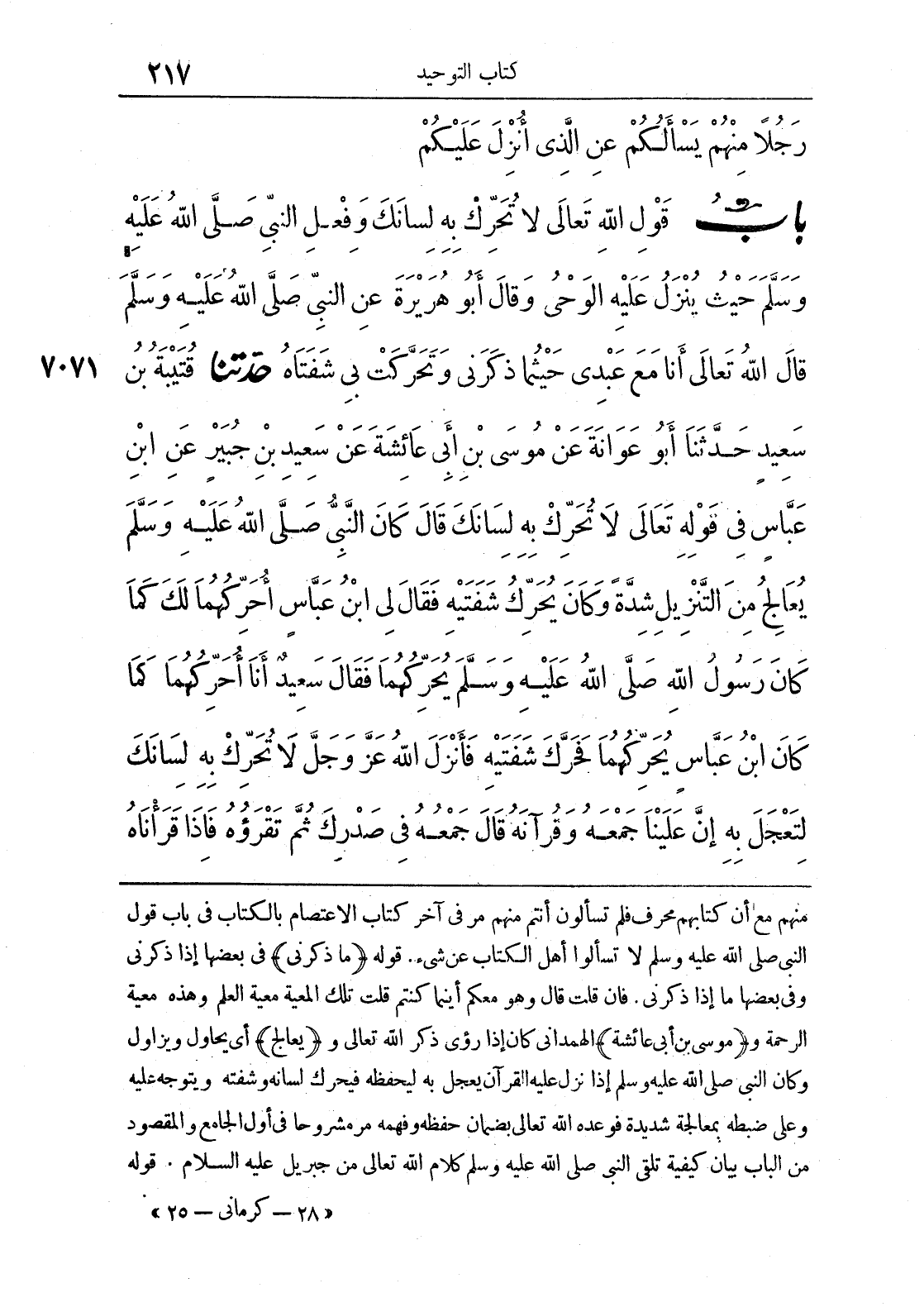 7071 - حَدَّثَنَا قُتَيْبَةُ بْنُ سَعِيدٍ حَدَّثَنَا أَبُو عَوَانَةَ عَنْ مُوسَى بْنِ أَبِي عَائِشَةَ عَنْ سَعِيدِ بْنِ جُبَيْرٍ عَنْ ابْنِ عَبَّاسٍ فِي قَوْلِهِ تَعَالَى {لَا تُحَرِّكْ بِهِ لِسَانَكَ} قَالَ كَانَ النَّبِيُّ صَلَّى اللَّهُ عَلَيْهِ وَسَلَّمَ يُعَالِجُ مِنْ التَّنْزِيلِ شِدَّةً وَكَانَ يُحَرِّكُ شَفَتَيْهِ فَقَالَ لِي ابْنُ عَبَّاسٍ فَأَنَا أُحَرِّكُهُمَا لَكَ كَمَا كَانَ رَسُولُ اللَّهِ صَلَّى اللَّهُ عَلَيْهِ وَسَلَّمَ يُحَرِّكُهُمَا فَقَالَ سَعِيدٌ أَنَا أُحَرِّكُهُمَا كَمَا كَانَ ابْنُ عَبَّاسٍ يُحَرِّكُهُمَا فَحَرَّكَ شَفَتَيْهِ فَأَنْزَلَ اللَّهُ عَزَّ وَجَلَّ {لَا تُحَرِّكْ بِهِ لِسَانَكَ لِتَعْجَلَ بِهِ إِنَّ عَلَيْنَا جَمْعَهُ وَقُرْآنَهُ} قَالَ جَمْعُهُ فِي صَدْرِكَ ثُمَّ تَقْرَؤُهُ {فَإِذَا قَرَانَاهُ