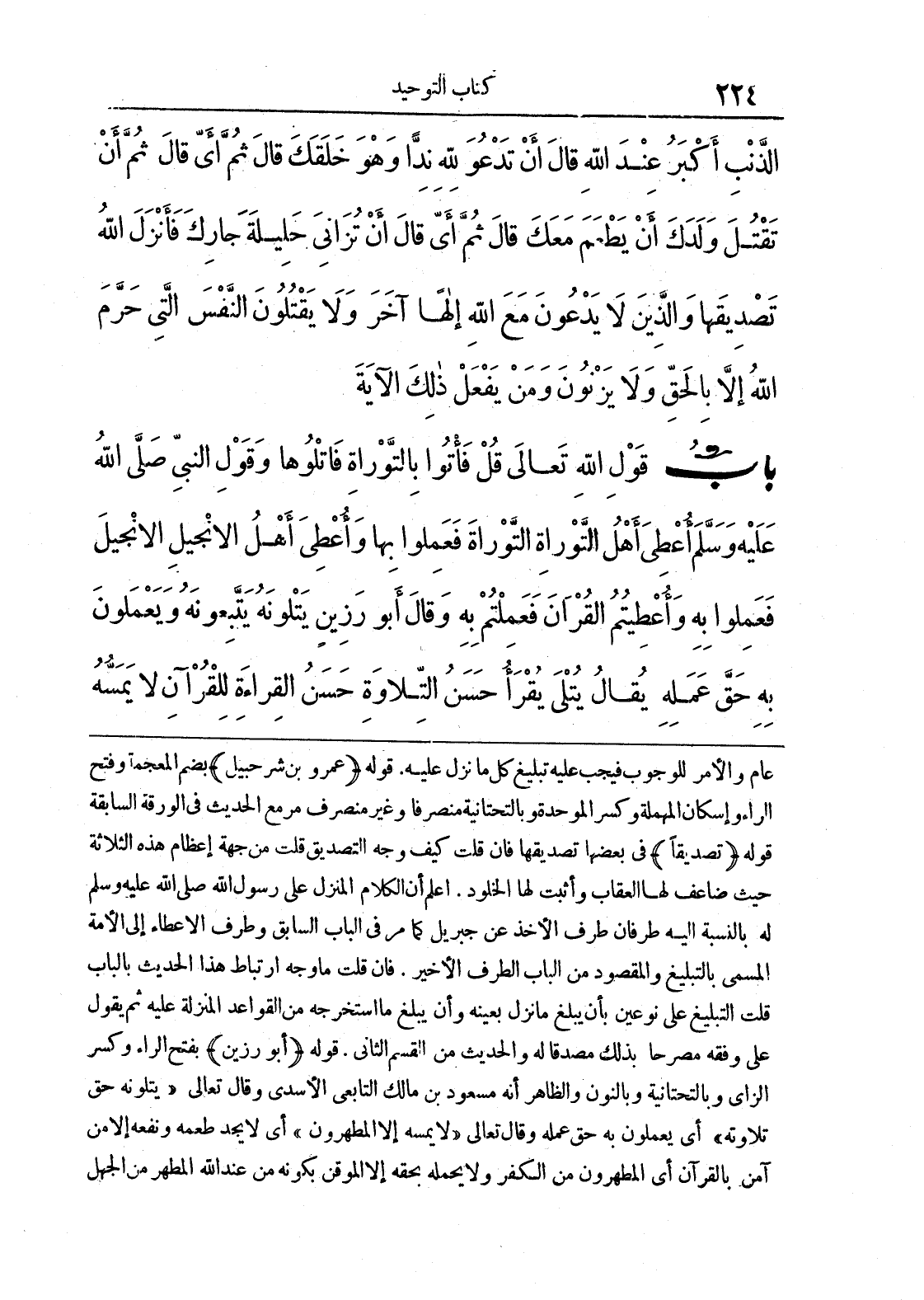 عام والأمر للوجوب فيجب عليه تبليغ كل ما نزل عليه، قوله {عمرو بن شرحبيل} بضم المعجمة وفتح الراء وإسكان المهملة وكسر الموحدة وبالتحتانية منصرفا وغير منصرف مر مع الحديث في الورقة السابقة قوله {تصديقا} في بعضها تصديقها فإن قلت كيف وجه التصديق قلت من جهة إعظام هذه الثلاثة حيث ضاعف لها العقاب وأثبت لها الخلود. اعلم أن الكلام المنزل على رسول الله صلى الله عليه وسلم له بالنسبة إليه طرفان طرف الأخذ عن جبريل كما مر في الباب السابق وطرف الإعطاء إلى الأمة المسمى بالتبليغ والمقصود من الباب الطرف الأخير، فإن قلت ما وجه ارتباط هذا الحديث بالباب قلت التبليغ على نوعين بأن يبلغ ما نزل بعينه وأن يبلغ ما استخرجه من القواعد المنزلة عليه ثم يقول على وفقه مصرحا بذلك مصدقا له والحديث في القسم الثاني. {باب قول الله تعالى قل فأتوا بالتوراة فاتلوها} قوله {أبو رزين} بفتح الراء وكسر الزاي وبالتحتانية وبالنون والظاهر أنه مسعود بن مالك التابعي الأسدي وقال تعالى " يتلونه حق تلاوته " أي يعملون به حق عمله وقال تعالى " لا يمسه إلا المطهرون " أي لا يجد طعمه ونفعه إلا من آمن بالقرآن أي المطهرون من الكفر ولا يحمله بحقه إلا الموقن بكونه من عند الله المطهر من الجهل
