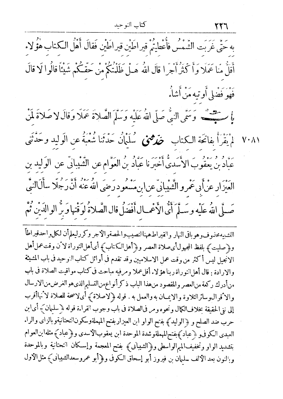 التشبيه محذوف وهو باقي النهار والقيراط ههنا النصيب والحصة والأجر وكرر ليعلم أن لكل واحد قيراطا و {صليت} بلفظ المجهول أي صلاة العصر و {أهل الكتاب} أي أهل التوراة لأن وقت عمل أهل الإنجيل ليس أكثر من وقت عمل الإسلاميين وقد تقدم في أوائل كتاب التوحيد المشيئة والإرادة: قال أهل التوراة ربنا هؤلاء أقل عملا ومر فيه مباحث في كتاب مواقيت الصلاة في باب من أدرك ركعة من العصر والمقصود من هذا الباب ذكر أنواع من التسليم الذي هو الغرض من الإرسال والأقوال وسائر التلاوة والإيمان به والعمل به، {باب وسمى النبي صلى الله عليه وسلم الصلاة عملا} قوله {لا صلاة} أي لا صحة للصلاة لأنها أقرب إلى نفي الحقيقة بخلاف الكمال ونحوه ومر في الصلاة في باب وجوب القراءة. قوله {سليمان} أي ابن حرب ضد الصلح و {الوليد} بفتح الواو ابن العيزار بفتح المهملة وسكون التحتانية وبالزاي والراء العبدي الكوفي و {عباد} بفتح المهملة وشدة الموحدة ابن يعقوب الأسدي و {عباد} مثله ابن العوام بتشديد الواو وتخفيف الميم الواسطي و {الشيباني} بفتح المعجمة وسكان التحتانية وبالموحدة وبالنون بعد الألف سليمان بن فيروز أبو إسحاق الكوفي و {أبو عمرو سعد الشيباني} مثل الأول