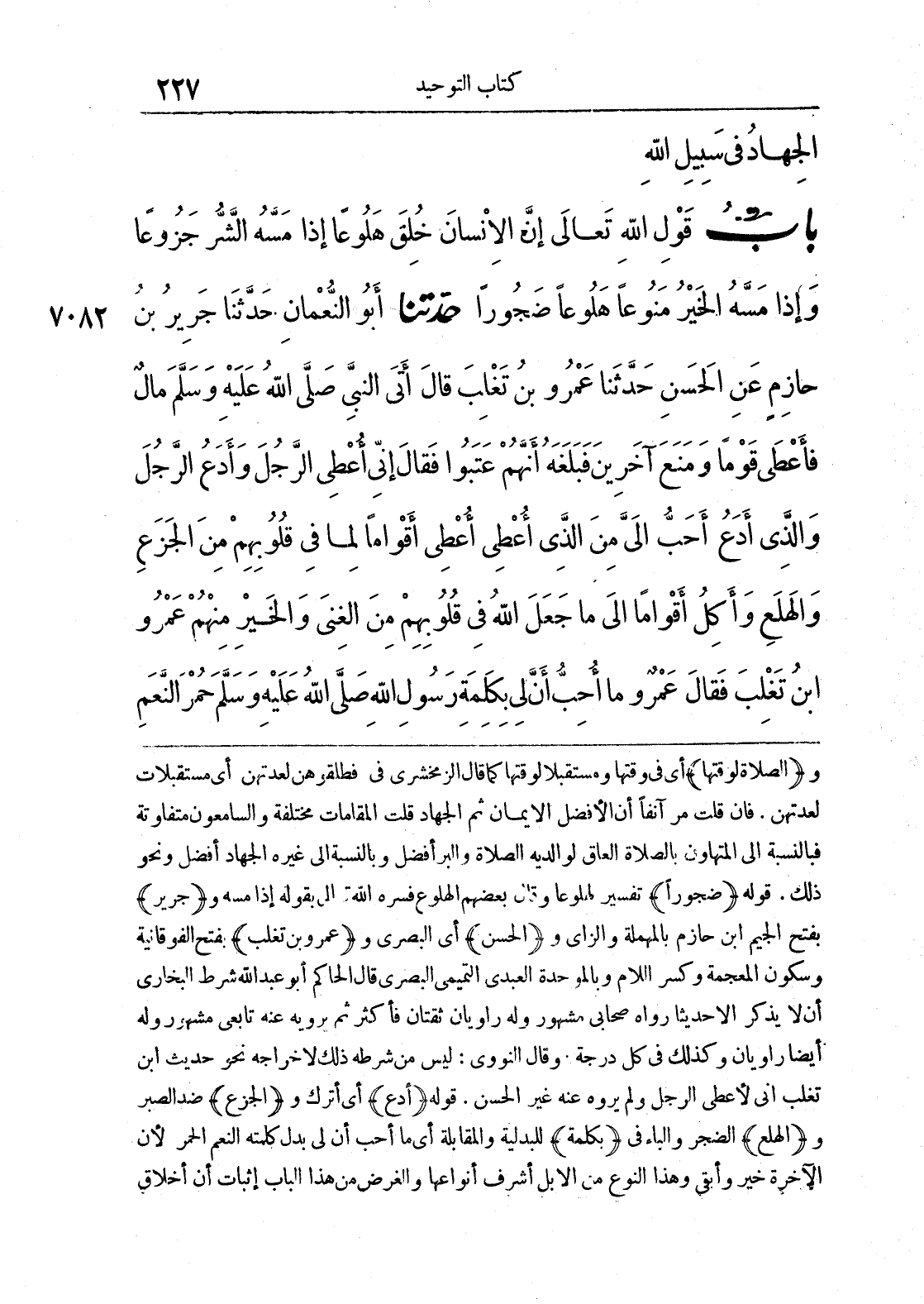 و {الصلاة لوقتها} أي في وقتها ومستقبلا لوقتها كما قال الزمخشري في فطلقوهن لعدتهن أي مستقبلات لعدتهن. فإن قلت مر آنفا أن الأفضل الإيمان ثم الجهاد قلت المقامات مختلفة والسامعون متفاوتتة فبالنسبة إلى المتهاون بالصلاة العاق لوالديه الصلاة والبر أفضل وبالنسبة إلى غيره الجهاد أفضل ونحو ذلك {باب قول الله تعالى إن الإنسان خلق هلوعا} قوله {ضجورا} تفسيرا لهلوعا وقال بعضهم الهلوع فسره الله تعالى بقوله إذا مسه و {جرير} بفتح الجيم ابن حازم بالمهملة والزاي و {الحسن} أي البصري و {عمرو بن تغلب} بفتح الفوقانية وسكون المعجمة وكسر اللام وبالموحدة العبدي التميمي البصري قال الحاكم أبو عبد الله شرط البخاري ألا يذكر إلا حديثا رواه صحابي مشهور وله راويان ثقتان فأكثر ثم يرويه عنه تابعي مشهور وله أيضا راويان وكذلك في كل درجة، وقال النووي: ليس من شرطه ذلك لإخراجه نحو حديث ابن تغلب إني لأعطي الرجل ولم يروه عنه غير الحسن. قوله {أدع} أي أترك و {الجزع} ضد الصبر و {الهلع} الضجر والباء في {بكلمة} للبدلية والمقابلة أي ما أحب أن لي بدل كلمته النعم الحمر لأن الآخرة خير وأبقى وهذا النوع من الإبل أشرف أنواعها والغرض من هذا الباب إثبات أن أخلاق