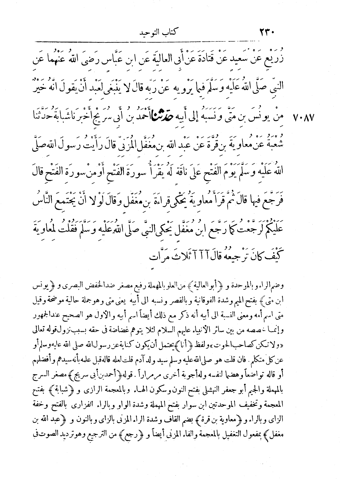 7087 - حَدَّثَنَا أَحْمَدُ بْنُ أَبِي سُرَيْجٍ أَخْبَرَنَا شَبَابَةُ حَدَّثَنَا شُعْبَةُ عَنْ مُعَاوِيَةَ بْنِ قُرَّةَ عَنْ عَبْدِ اللَّهِ بْنِ مُغَفَّلٍ الْمُزَنِيِّ قَالَ رَأَيْتُ رَسُولَ اللَّهِ صَلَّى اللَّهُ عَلَيْهِ وَسَلَّمَ يَوْمَ الْفَتْحِ عَلَى نَاقَةٍ لَهُ يَقْرَأُ سُورَةَ الْفَتْحِ أَوْ مِنْ سُورَةِ الْفَتْحِ قَالَ فَرَجَّعَ فِيهَا قَالَ ثُمَّ قَرَأَ مُعَاوِيَةُ يَحْكِي قِرَاءَةَ ابْنِ مُغَفَّلٍ وَقَالَ لَوْلَا أَنْ يَجْتَمِعَ النَّاسُ عَلَيْكُمْ لَرَجَّعْتُ كَمَا رَجَّعَ ابْنُ مُغَفَّلٍ يَحْكِي النَّبِيَّ صَلَّى اللَّهُ عَلَيْهِ وَسَلَّمَ فَقُلْتُ لِمُعَاوِيَةَ كَيْفَ كَانَ تَرْجِيعُهُ قَالَ آآ آثَلَاثَ مَرَّاتٍ