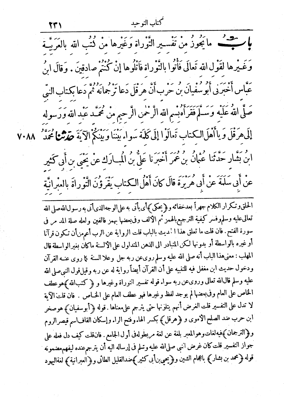 لِقَوْلِ اللَّهِ تَعَالَى {فَاتُوا بِالتَّوْرَاةِ فَاتْلُوهَا إِنْ كُنْتُمْ صَادِقِينَ} وَقَالَ ابْنُ عَبَّاسٍ أَخْبَرَنِي أَبُو سُفْيَانَ بْنُ حَرْبٍ أَنَّ هِرَقْلَ دَعَا تَرْجُمَانَهُ ثُمَّ دَعَا بِكِتَابِ النَّبِيِّ صَلَّى اللَّهُ عَلَيْهِ وَسَلَّمَ فَقَرَأَهُ بِسْمِ اللَّهِ الرَّحْمَنِ الرَّحِيمِ مِنْ مُحَمَّدٍ عَبْدِ اللَّهِ وَرَسُولِهِ إِلَى هِرَقْلَ وَ {يَا أَهْلَ الْكِتَابِ تَعَالَوْا إِلَى كَلِمَةٍ سَوَاءٍ بَيْنَنَا وَبَيْنَكُمْ} الْآيَةَ