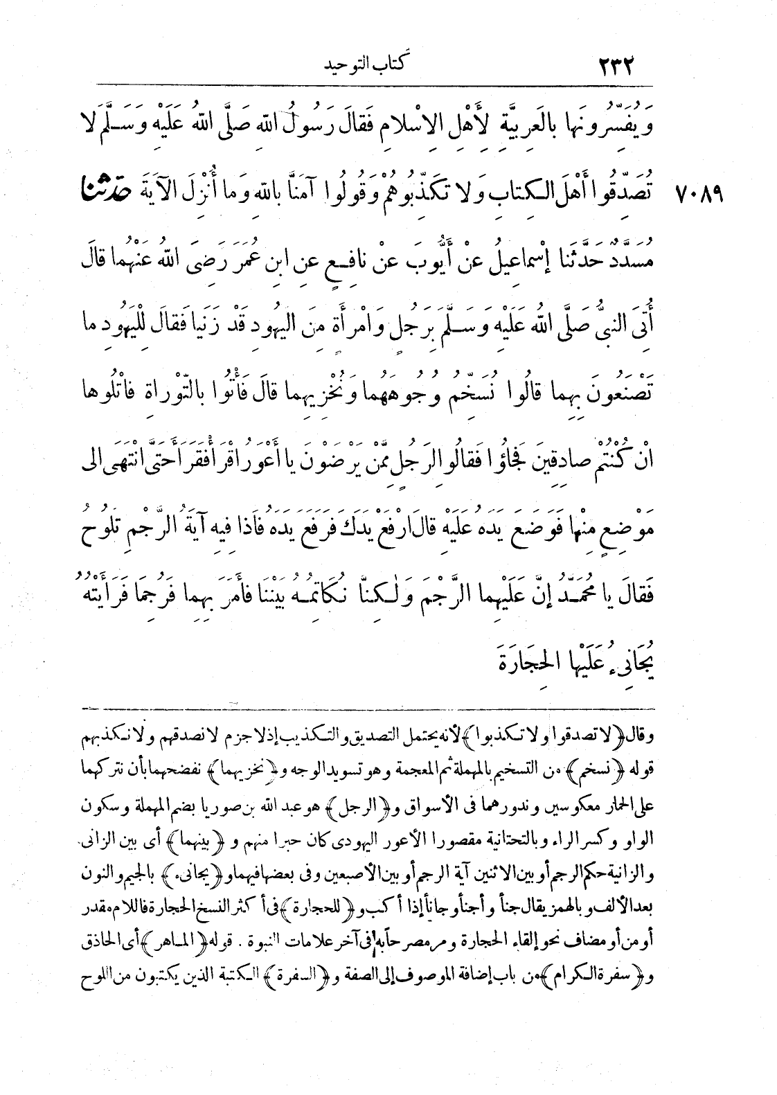 7089 - حَدَّثَنَا مُسَدَّدٌ حَدَّثَنَا إِسْمَاعِيلُ عَنْ أَيُّوبَ عَنْ نَافِعٍ عَنْ ابْنِ عُمَرَ رَضِيَ اللَّهُ عَنْهُمَا قَالَ أُتِيَ النَّبِيُّ صَلَّى اللَّهُ عَلَيْهِ وَسَلَّمَ بِرَجُلٍ وَامْرَأَةٍ مِنْ الْيَهُودِ قَدْ زَنَيَا فَقَالَ لِلْيَهُودِ مَا تَصْنَعُونَ بِهِمَا قَالُوا نُسَخِّمُ وُجُوهَهُمَا وَنُخْزِيهِمَا قَالَ {فَاتُوا بِالتَّوْرَاةِ فَاتْلُوهَا إِنْ كُنْتُمْ صَادِقِينَ} فَجَاءُوا فَقَالُوا لِرَجُلٍ مِمَّنْ يَرْضَوْنَ يَا أَعْوَرُ اقْرَا فَقَرَأَ حَتَّى انْتَهَى إِلَى مَوْضِعٍ مِنْهَا فَوَضَعَ يَدَهُ عَلَيْهِ قَالَ ارْفَعْ يَدَكَ فَرَفَعَ يَدَهُ فَإِذَا فِيهِ آيَةُ الرَّجْمِ تَلُوحُ فَقَالَ يَا مُحَمَّدُ إِنَّ عَلَيْهِمَا الرَّجْمَ وَلَكِنَّا نُكَاتِمُهُ بَيْنَنَا فَأَمَرَ بِهِمَا فَرُجِمَا فَرَأَيْتُهُ يُجَانِئُ عَلَيْهَا الْحِجَارَةَ