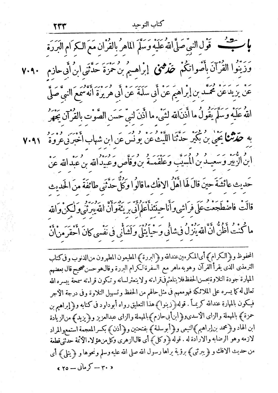المحفوظ و {الكرام} أي المكرمين عند الله و {البررة} المطيعون المطهرون من الذنوب وفي كتاب الترمذي الذي يقرأ القرآن وهو به ماهر مع السفرة الكرام البررة وقال هو حسن صحيح قال بعضهم المهارة جودة التلاوة بحسن الحفظ فلا يتلعثم في قراءته ولا يتعثر لسانه وتكون قراءته سمحة ييسره الله تعالى له كما يسره على الملائكة فهو معهم في مثل حالهم من الحفظ وتسهيل التلاوة وفي درجة الأجر فيكون بالمهارة عند الله كريما. قوله {زينوا} هذا التعليق رواه أبو داود في كتابه و {إبراهيم بن حمزة} بالمهملة والزاي الأسدي و {ابن أبي حازم} بالمهملة والزاي عبد العزيز و {يزيد} من الزيادة ابن الهاد و {محمد بن إبراهيم} التيمي و {أبو سلمة} بفتحتين و {أذن} بكسر المعجمة استمع والمراد لازمه وهو الرضا به والإرادة له. قوله {وكلّ} أي قال الزهري وكل من هؤلاء الأئمة حدثني قطعة من حديث الإفك و {يبرئني} برؤية يراها رسول الله صلى الله عليه وسلم ونحوها و {يتلى} أي