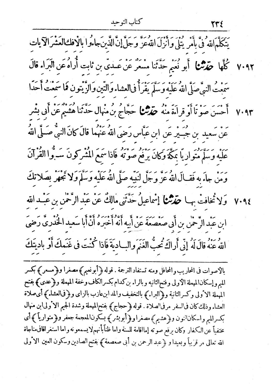 7093 - حَدَّثَنَا حَجَّاجُ بْنُ مِنْهَالٍ حَدَّثَنَا هُشَيْمٌ عَنْ أَبِي بِشْرٍ عَنْ سَعِيدِ بْنِ جُبَيْرٍ عَنْ ابْنِ عَبَّاسٍ رَضِيَ اللَّهُ عَنْهُمَا قَالَ كَانَ النَّبِيُّ صَلَّى اللَّهُ عَلَيْهِ وَسَلَّمَ مُتَوَارِيًا بِمَكَّةَ وَكَانَ يَرْفَعُ صَوْتَهُ فَإِذَا سَمِعَ الْمُشْرِكُونَ سَبُّوا الْقُرْآنَ وَمَنْ جَاءَ بِهِ فَقَالَ اللَّهُ عَزَّ وَجَلَّ لِنَبِيِّهِ صَلَّى اللَّهُ عَلَيْهِ وَسَلَّمَ {وَلَا تَجْهَرْ بِصَلَاتِكَ وَلَا تُخَافِتْ بِهَا}