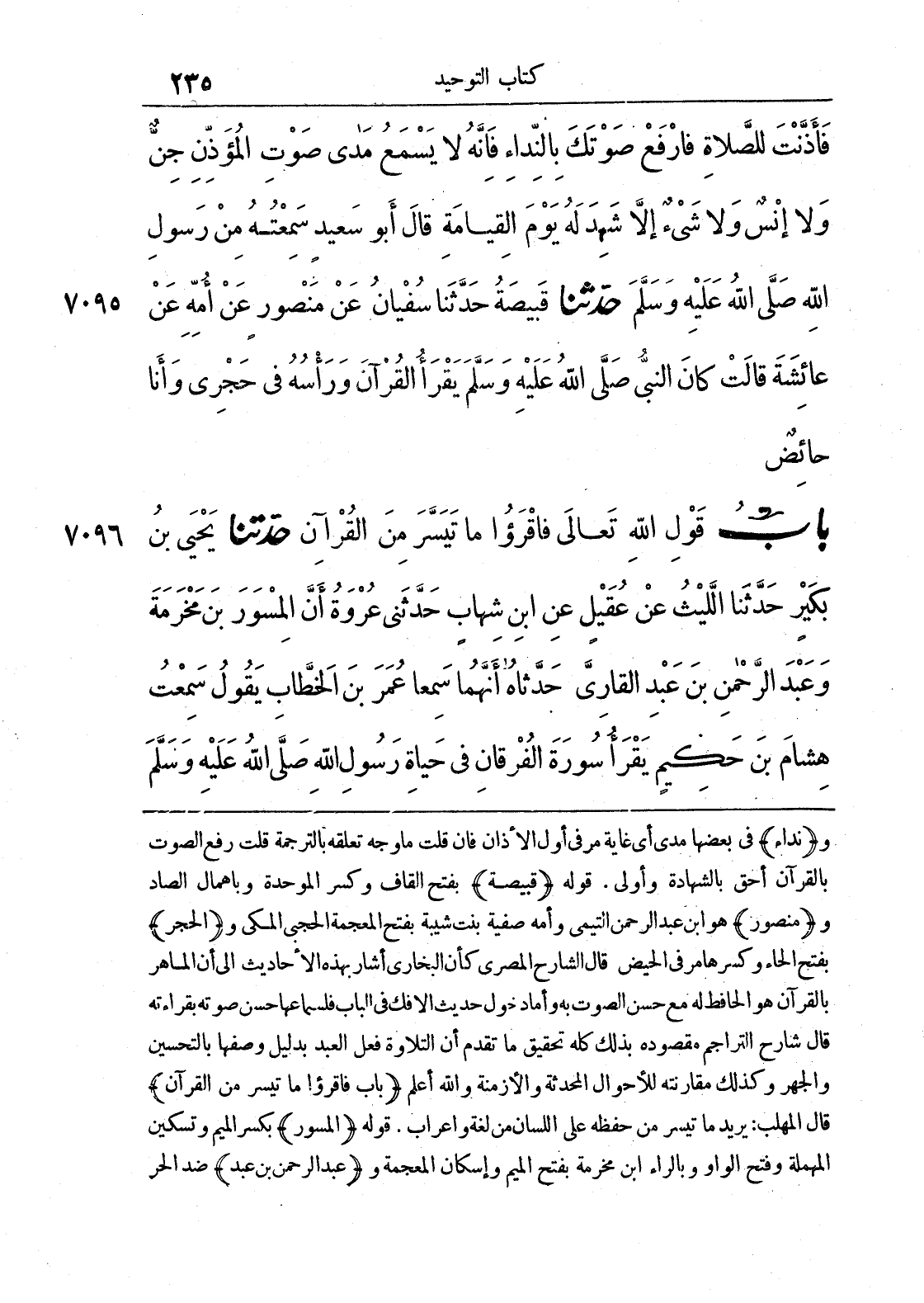 7096 - حَدَّثَنَا يَحْيَى بْنُ بُكَيْرٍ حَدَّثَنَا اللَّيْثُ عَنْ عُقَيْلٍ عَنْ ابْنِ شِهَابٍ حَدَّثَنِي عُرْوَةُ أَنَّ الْمِسْوَرَ بْنَ مَخْرَمَةَ وَعَبْدَ الرَّحْمَنِ بْنَ عَبْدٍ الْقَارِيَّ حَدَّثَاهُ أَنَّهُمَا سَمِعَا عُمَرَ بْنَ الْخَطَّابِ يَقُولُ سَمِعْتُ هِشَامَ بْنَ حَكِيمٍ يَقْرَأُ سُورَةَ الْفُرْقَانِ فِي حَيَاةِ رَسُولِ اللَّهِ صَلَّى اللَّهُ عَلَيْهِ وَسَلَّمَ