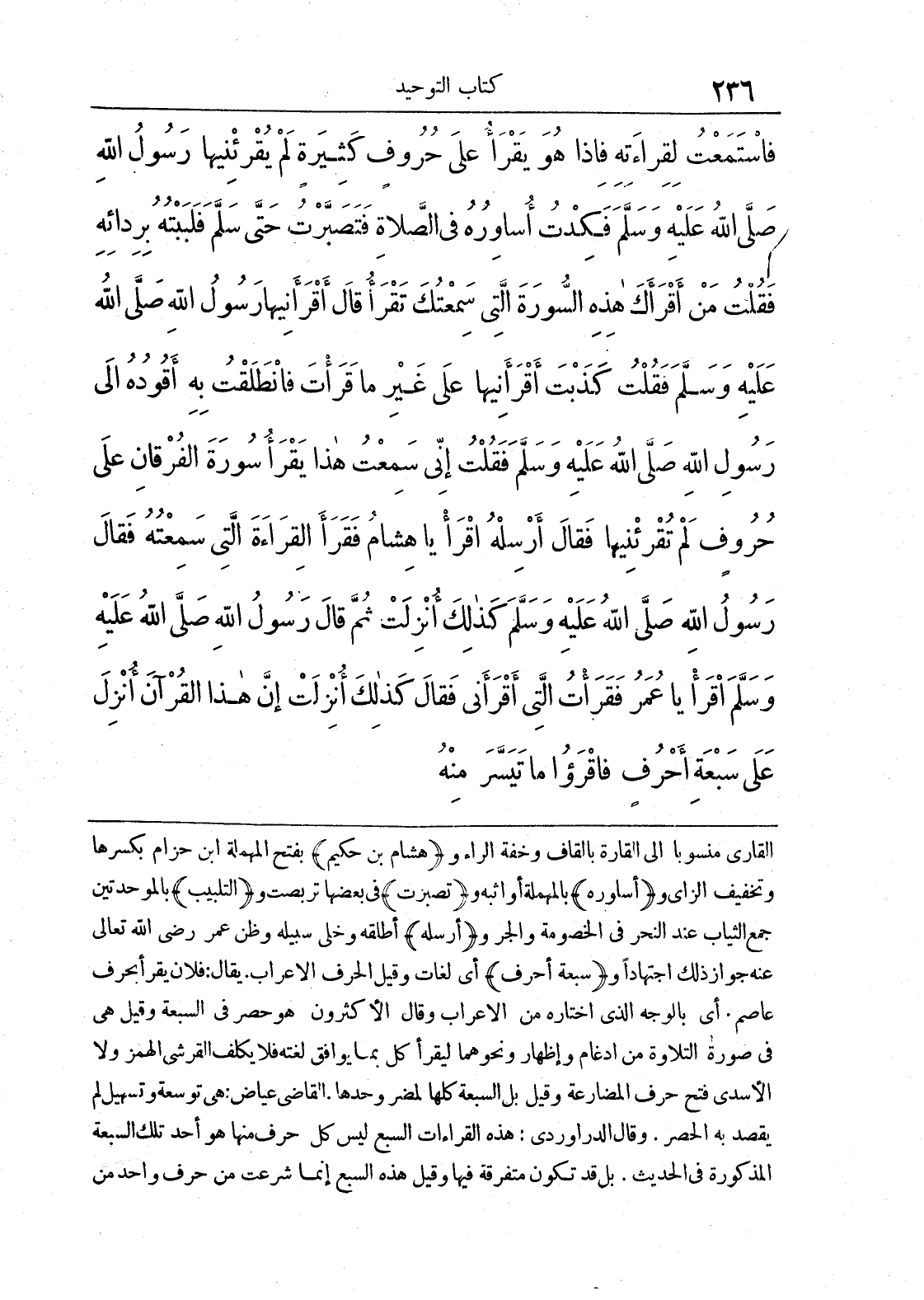 القارئ منسوبا إلى القارة بالقاف وخفة الراء و {هشام بن حكيم} بفتح المهملة ابن حزام بكسرها وتخفيف الزاي و {أساوره} بالمهملة أواثبه و {تصبرت} في بعضها تربصت و {التلبيب} بالموحدتين جمع الثياب عند النحر في الخصومة والجر و {أرسله} أطلقه وخلى سبيله وظن عمر رضي الله تعالى عنه جواز ذلك اجتهادا و {سبعة أحرف} أي لغات وقيل الحرف الإعراب. يقال: فلان يقرأ بحرف عاصم أي بالوجه الذي اختاره من الإعراب وقال الأكثرون هو حصر في السبعة وقيل هي في صورة التلاوة من إدغام وإظهار ونحوهما ليقرأ كل بما يوافق لغته فلا يكلف القرشي الهمز ولا الأسدي فتح حرف المضارعة وقيل بل السبعة كلها لمضر وحدها القاضي عياض: هي توسعة وتسهيل لم يقصد به الحصر. وقال الدراوردي: هذه القراءات السبع ليس كل حرف منها هو أحد تلك السبعة المذكورة في الحديث. بل تكون متفرقة فيها وقيل هذه السبع إنما شرعت من حرف واحد من