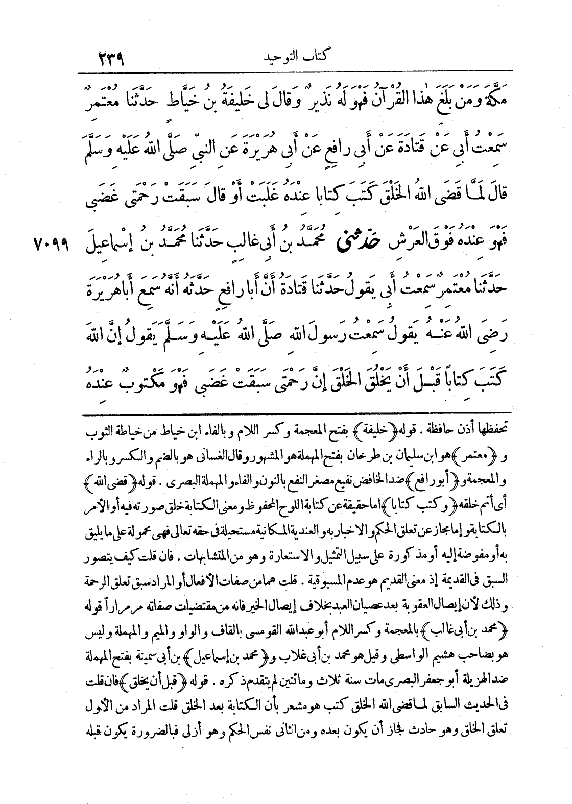 7099 - حَدَّثَنِي مُحَمَّدُ بْنُ أَبِي غَالِبٍ حَدَّثَنَا مُحَمَّدُ بْنُ إِسْمَاعِيلَ حَدَّثَنَا مُعْتَمِرٌ سَمِعْتُ أَبِي يَقُولُ حَدَّثَنَا قَتَادَةُ أَنَّ أَبَا رَافِعٍ حَدَّثَهُ أَنَّهُ سَمِعَ أَبَا هُرَيْرَةَ رَضِيَ اللَّهُ عَنْهُ يَقُولُ سَمِعْتُ رَسُولَ اللَّهِ صَلَّى اللَّهُ عَلَيْهِ وَسَلَّمَ يَقُولُ إِنَّ اللَّهَ كَتَبَ كِتَابًا قَبْلَ أَنْ يَخْلُقَ الْخَلْقَ إِنَّ رَحْمَتِي سَبَقَتْ غَضَبِي فَهُوَ مَكْتُوبٌ عِنْدَهُ
