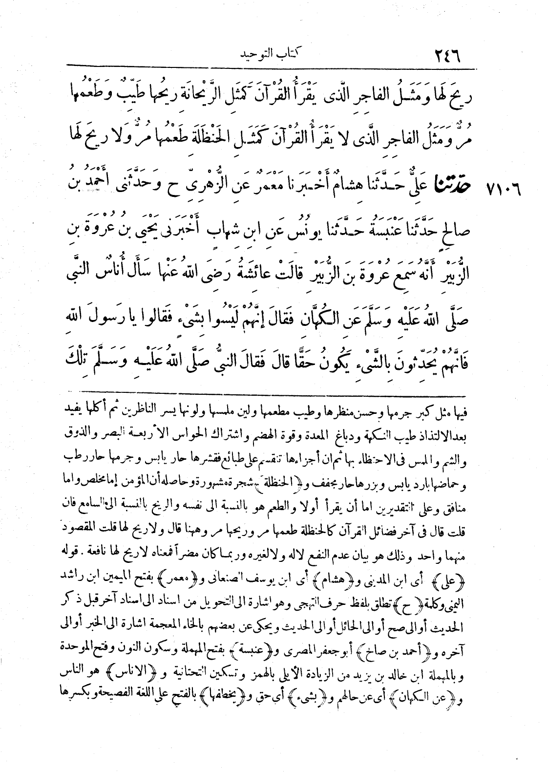 7106 - حَدَّثَنَا عَلِيٌّ حَدَّثَنَا هِشَامٌ أَخْبَرَنَا مَعْمَرٌ عَنْ الزُّهْرِيِّ ح وحَدَّثَنِي أَحْمَدُ بْنُ صَالِحٍ حَدَّثَنَا عَنْبَسَةُ حَدَّثَنَا يُونُسُ عَنْ ابْنِ شِهَابٍ أَخْبَرَنِي يَحْيَى بْنُ عُرْوَةَ بْنِ الزُّبَيْرِ أَنَّهُ سَمِعَ عُرْوَةَ بْنَ الزُّبَيْرِ قَالَتْ عَائِشَةُ رَضِيَ اللَّهُ عَنْهُمَا سَأَلَ أُنَاسٌ النَّبِيَّ صَلَّى اللَّهُ عَلَيْهِ وَسَلَّمَ عَنْ الْكُهَّانِ فَقَالَ إِنَّهُمْ لَيْسُوا بِشَيْءٍ فَقَالُوا يَا رَسُولَ اللَّهِ فَإِنَّهُمْ يُحَدِّثُونَ بِالشَّيْءِ يَكُونُ حَقًّا قَالَ فَقَالَ النَّبِيُّ صَلَّى اللَّهُ عَلَيْهِ وَسَلَّمَ تِلْكَ