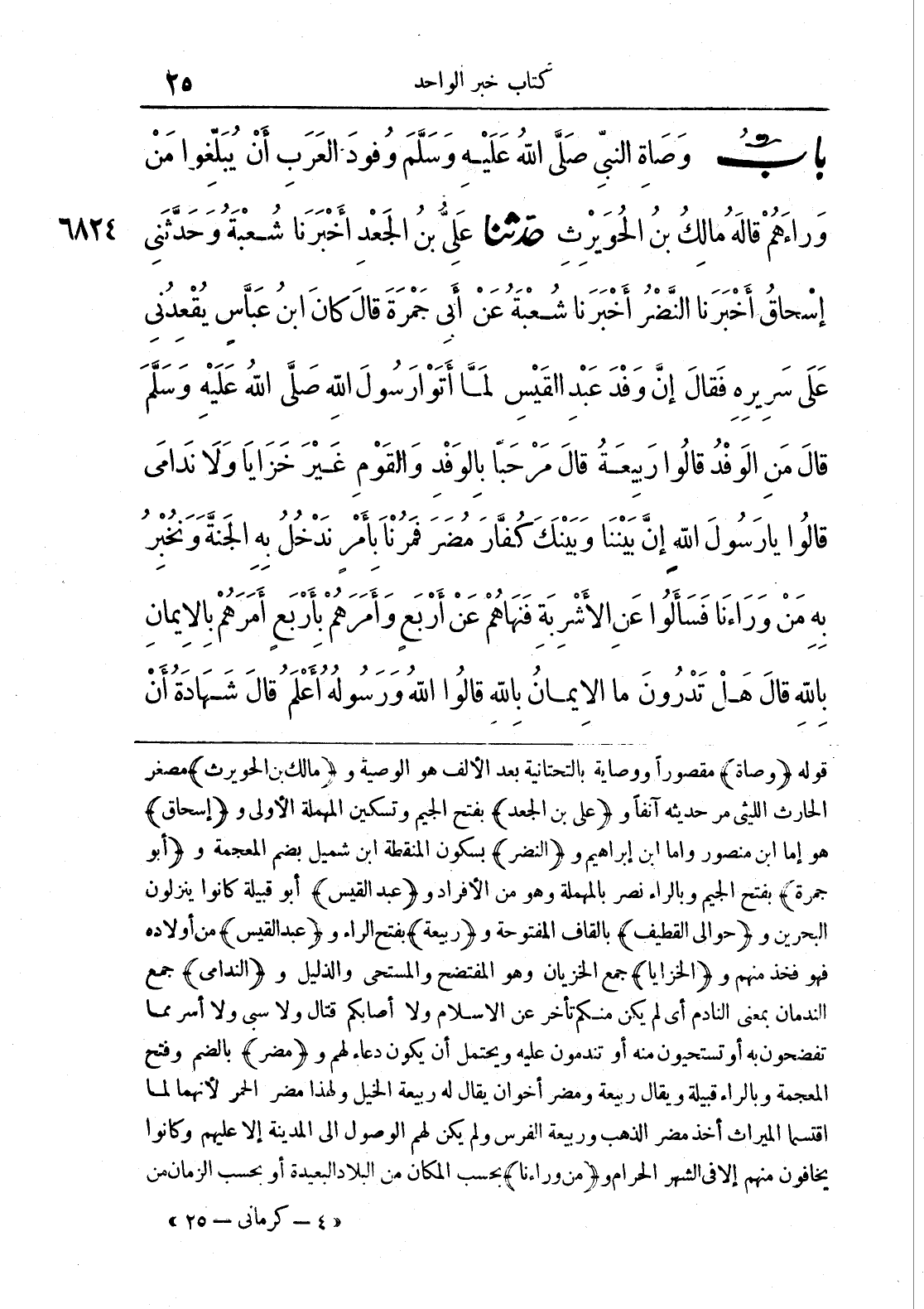 قوله {وصاة} مقصورا ووصاية بالتحتانية بعد الألف هو الوصية و {مالك بن الحويرث} مصغر الحارث الليثي مر حديثه آنفا و {علي بن الجعد} بفتح الجيم وتسكين المهملة الأولى و {إسحاق} هو إما ابن منصور وإما ابن إبراهيم و {النضر} بسكون المنقطة ابن شميل بضم المعجمة و {أبو جمرة} بفتح الجيم وبالراء نصر بالمهملة وهو من الأفراد و {عبد القيس} أبو قبيلة كانوا ينزلون البحرين و {حوالي القطيف} بالقاف المفتوحة و {ربيعة} بفتح الراء و {عبد القيس} من أولاده فهو فخذ منهم و {الخزايا} جمع الخزيان وهو المفتضح والمستحي والذليل و {الندامى} جمع الندمان بمعنى النادم أي لم يكن منكم تأخر عن الإسلام ولا أصابكم قتال ولا سبي ولا أسر مما تفضحون به أو تستحيون منه أو تندمون عليه ويحتمل أن يكون دعاء لهم و {مضر} بالضم وفتح المعجمة وبالراء قبيلة ويقال ربيعة ومضر أخوان يقال له ربيعة الخيل ولهذا مضر الحمر لأنهما لما اقتسمتا الميراث أخذ مضر الذهب وربيعة الفرس ولم يكن لهم الوصول إلى المدينة إلا عليهم وكانوا يخافون منهم إلا في الشهر الحرام و {من وراءنا} بحسب المكان من البلاد البعيدة أو بحسب الزمان من