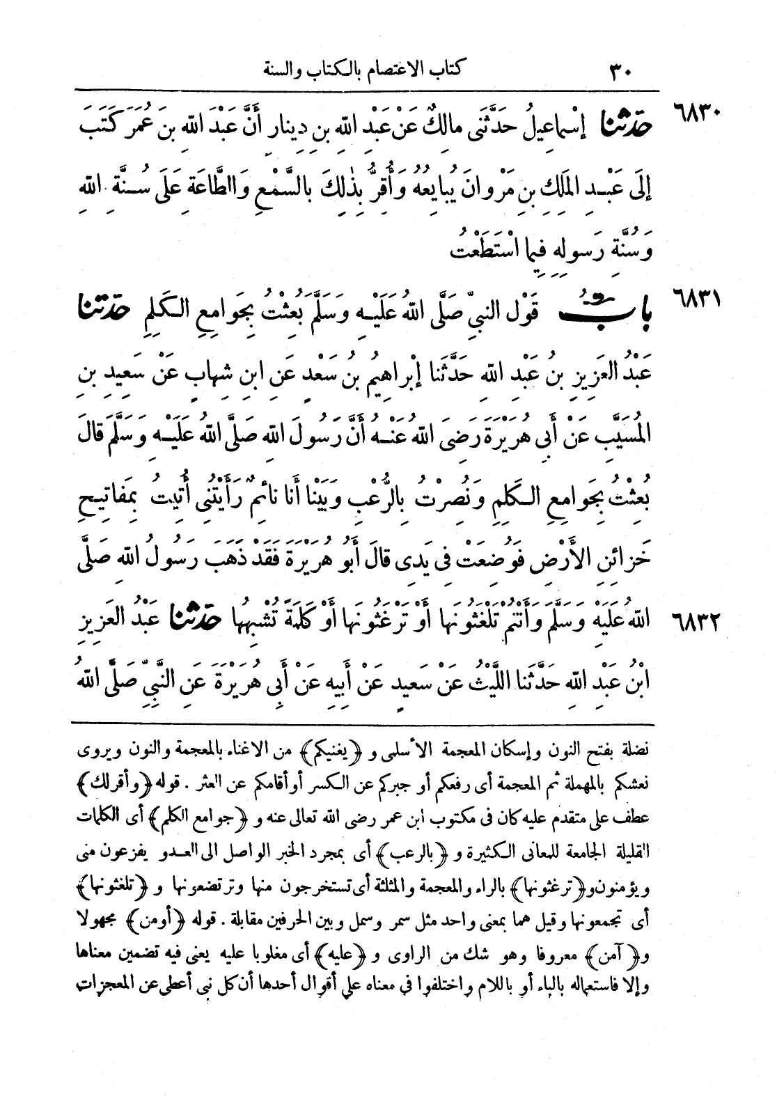 نضلة بفتح النون وإسكان المعجمة الأسلمي و {يغنيكم} من الإغناء بالمعجمة والنون ويروى نعشكم بالمهملة ثم المعجمة أي رفعكم أو جبركم عن الكسر أو أقامكم عن العثر. قوله {وأقر لك} عطف على متقدم عليه كان في مكتوب ابن عمر رضي الله تعالى عنه {باب قول النبي صلى الله عليه وسلم بعثت بجوامع الكلم} و {جوامع الكلم} أي الكلمات القليلة الجامعة للمعاني الكثيرة و {بالرعب} أي بمجرد الخبر الوصل إلى العدو يفزعون مني ويؤمنون و {ترغثونها} بالراء والمعجمة والمثلثة ي تستخرجون منها وترتضعونها و {تلغثونها} أي تجمعونها وقيل هما بمعنى واحد مثل سمر وسمل وبين الحرفين مقابلة. قوله {أومن} مجهولا و {آمن} معروفا وهو شك من الراوي و {عليه} أي مغلوبا عليه يعني فيه تضمين معناها وإلا فاستعماله بالباء أو باللام واختلفوا في معناه على أقوال أحدها أن كل نبي أعطي عن المعجزات