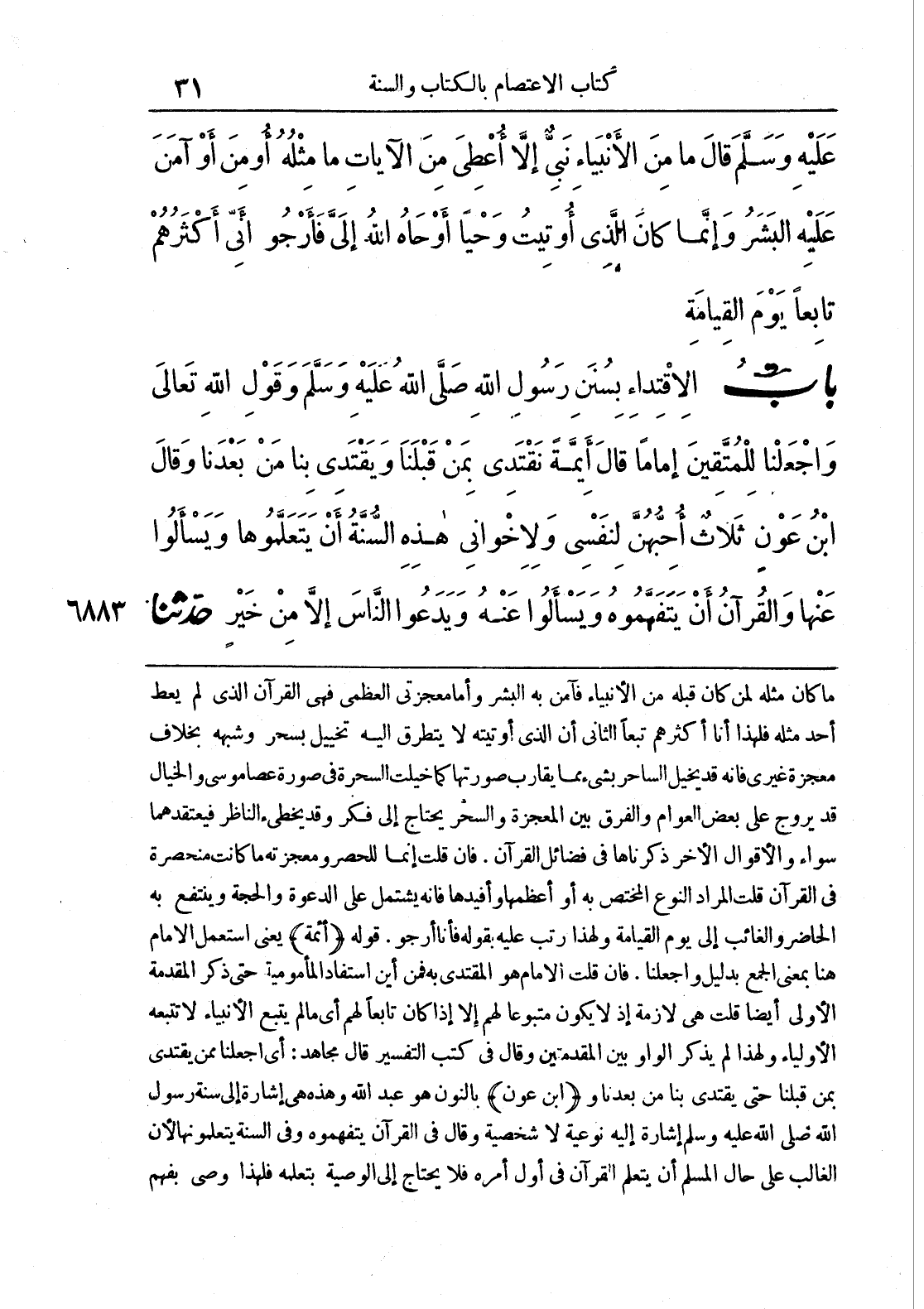 ما كان مثله لمن كان قبله من الأنبياء فآمن به البشر وأما معجزتي العظمى فهي القرآن الذي لم يعط أحد مثله فلهذا أنا أكثرهم تبعا للثاني أن الذي أوتيته لا يتطرق غليه تخييل بسحر وشبهه بخلاف معجزة غيري فإنه قد يخيل الساحر بشيء مما يقارب صورتها كما خيلت السحرة في صورة عصا موسى والخيال قد يروج على بعض العوام والفرق بين المعجزة والسحر يحتاج إلى فكر وقد يخطئ الناظر فيعتقدهما سواء والأقوال الأخر ذكرناها في فضائل القرآن. فإن قلت إنما للحصر ومعجزته ما كانت منحصرة في القرآن قلت المراد النوع المختص به أو أعظمها وأفيدها فإنه يشتمل على الدعوة والحجة وينتفع به الحضر والغائب إلى يوم القيامة ولهذا رتب عليه بقوله أنا أرجو، {باب الإقتداء بسنن رسول الله صلى الله عليه وسلم} قوله {أئمة} يعني استعمل الإمام هنا بمعنى الجمع بدليل واجعلنا. فإن قلت الإمام هو المقتدى به فمن أين استفاد المأمومية حتى ذكر المقدمة الأولى أيضا قلت هي لازمة إذ لا يكون متبوعا لهم إلا إذا كان تابعا لهم أي مالم يتبع الأنبياء لا تتبعه الأولياء ولهذا لم يذكر الواو بين المقدمتين وقال في كتب التفسير قال مجاهد: أي اجعلنا ممن يقتدي بمن قبلنا حتى يقتدي بنا من بعدنا و {ابن عون} بالنون هو عبد الله وهذه هي إشارة إلى سنة رسول الله صلى الله عليه وسلم إشارة إليه نوعية لا شخصية وقال في القرآن يتفهموه وفي السنة يتعلمونها لأن الغالب على حال المسلم أن يتعلم القرآن في أول أمره فلا يحتاج إلى الوصية بتعلمه فلهذا وصى بفهم