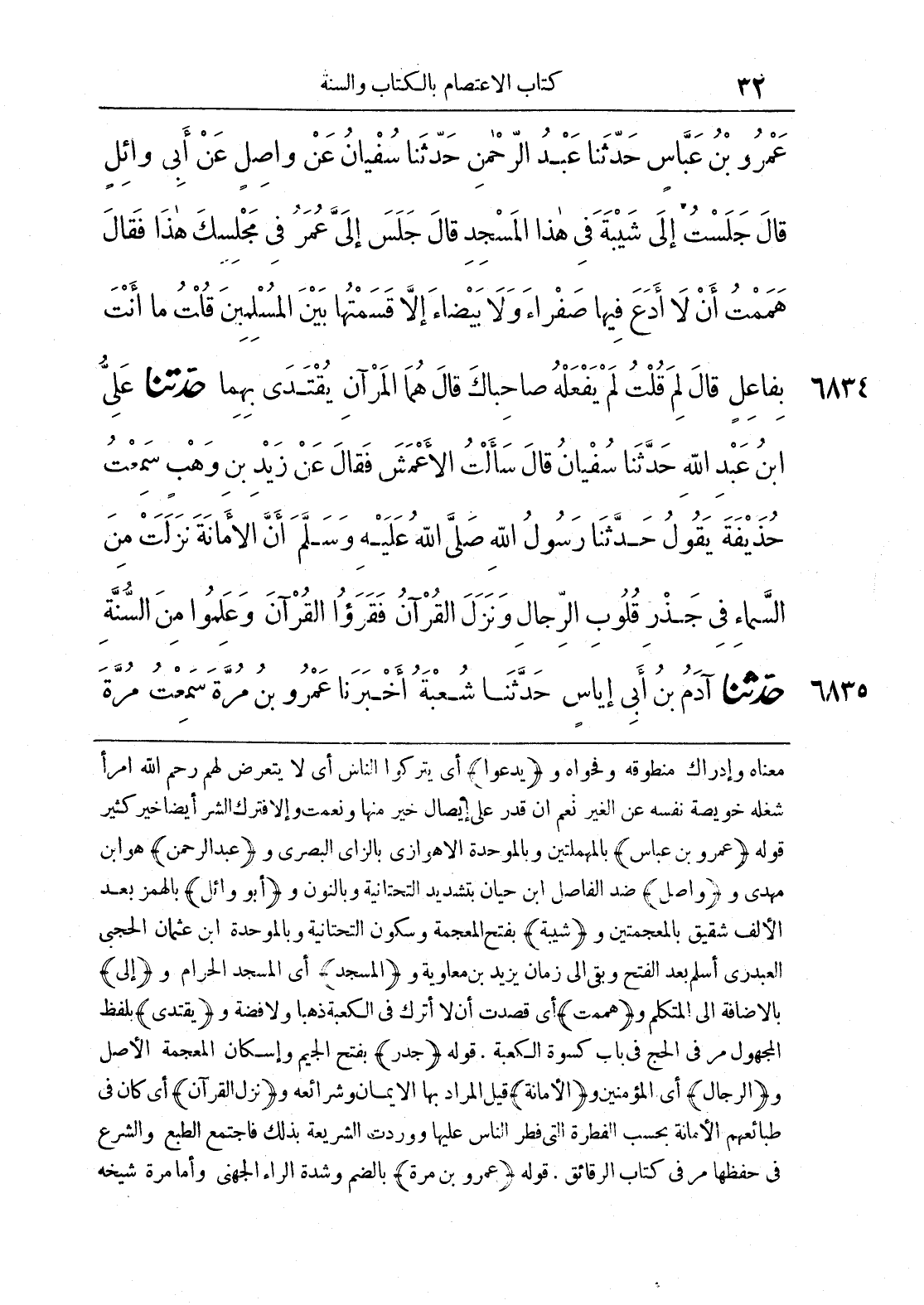 معناه وإدراك منطوقه وفحواه و {يدعوا} أي يتركوا الناس أي لايتعرض لهم رحم الله امرأ شغله خويصة نفسه عن الغير نعم إن قدر على إيصال خير منها ونعمت وإلا فترك الشر أيضا خير كثير. قوله {عمرو بن عباس} بالمهملتين وبالموحدة الأهوازي بالزاي البصري و {عبد الرحمن} هو ابن مهدي و {واصل} ضد الفاصل ابن حيان بتشديد التحتانية وبالنون و {أبو وائل} بالهمز بعد الألف شقيق بالمعجمتين و {شيبة} بفتح المعجمة وسكون التحتانية وبالموحدة ابن عثمان الحجي العبدري أسلم بعد الفتح وبقي إلى زمان يزيد بن معاوية و {المسجد} أي المسجد الحرام و {إلى} بالإضافة إلى المتكلم و {هممت} أي قصدت أن لا أترك في الكعبة ذهبا ولا فضة و {يقتدى} بلفظ المجهول مر في الحج في باب كسوة الكعبة. قوله {جدر} بفتح الجيم وإسكان المعجمة الأصل و {الرجال} أي المؤمنين و {الأمانة} قيل المراد بها الإيمان وشرائعه و {نزل القرآن} أي كان في طبائعهم الأمانة بحسب الفطرة التي فطر الناس عليها ووردت الشريعة بذلك فاجتمع الطبع والشرع في حفظها مر في كتاب الرقائق. قوله {عمرو بن مرة} بالضم وشدة الراء الجهني وأما مرة شيخه