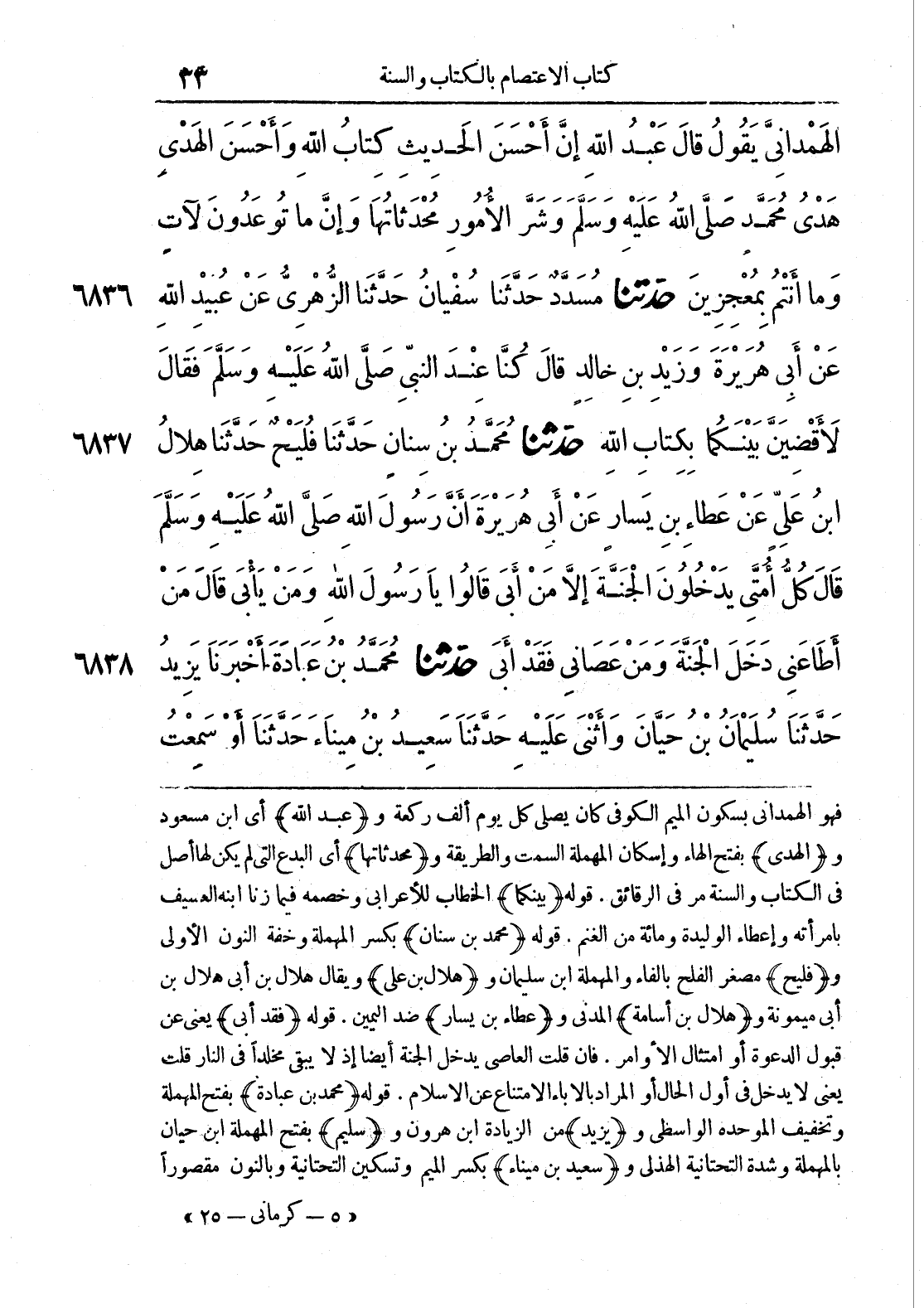 فهو الهمداني بسكون الميم الكوفي كان يصلي كل يوم ألف ركعة و {عبد الله} أي ابن مسعود و {الهدى} بفتح الاء وإسكان المهملة السمت والطريقة و {محدثاتها} أي البدع التي لم يكن لها أصل في الكتاب والسنة مر في الرقائق. قوله {بينكما} الخطاب للأعرابي وخصمه فيما زنا ابنه العسيف بامرأته وإعطاء الوليدة ومائة من الغنم. قوله {محمد بن سنان} بكسر المهملة وخفة النون الأولى و {فليح} مصغر الفلح بالفاء والمهملة ابن سليمان و {هلال بن علي} ويقال هلال بن أبي هلال بن أبي ميمونة و {هلال بن أسامة} المدني و {عطاء بن يسار} ضد اليمين. قوله {فقد أبى} يعني عن قبول الدعوة أو امتثال الأوامر. فإن قلت العاصي يدخل الجنة أيضا إذ لا يبقى مخلدا في النار قلت يعني لا يدخل في أول الحال أو المراد بالإباء الامتناع عن الإسلام. قوله {محمد بن عبادة} بفتح المهملة وتخفيف الموحدة الواسطي و {يزيد} من الزيادة ابن هرون و {سليم} بفتح المهملة ابن حيان بالمهملة وشدة التحتانية الهذلي و {سعيد بن ميناء} بكسر الميم وتسكين التحتانية وبالنون مقصورا