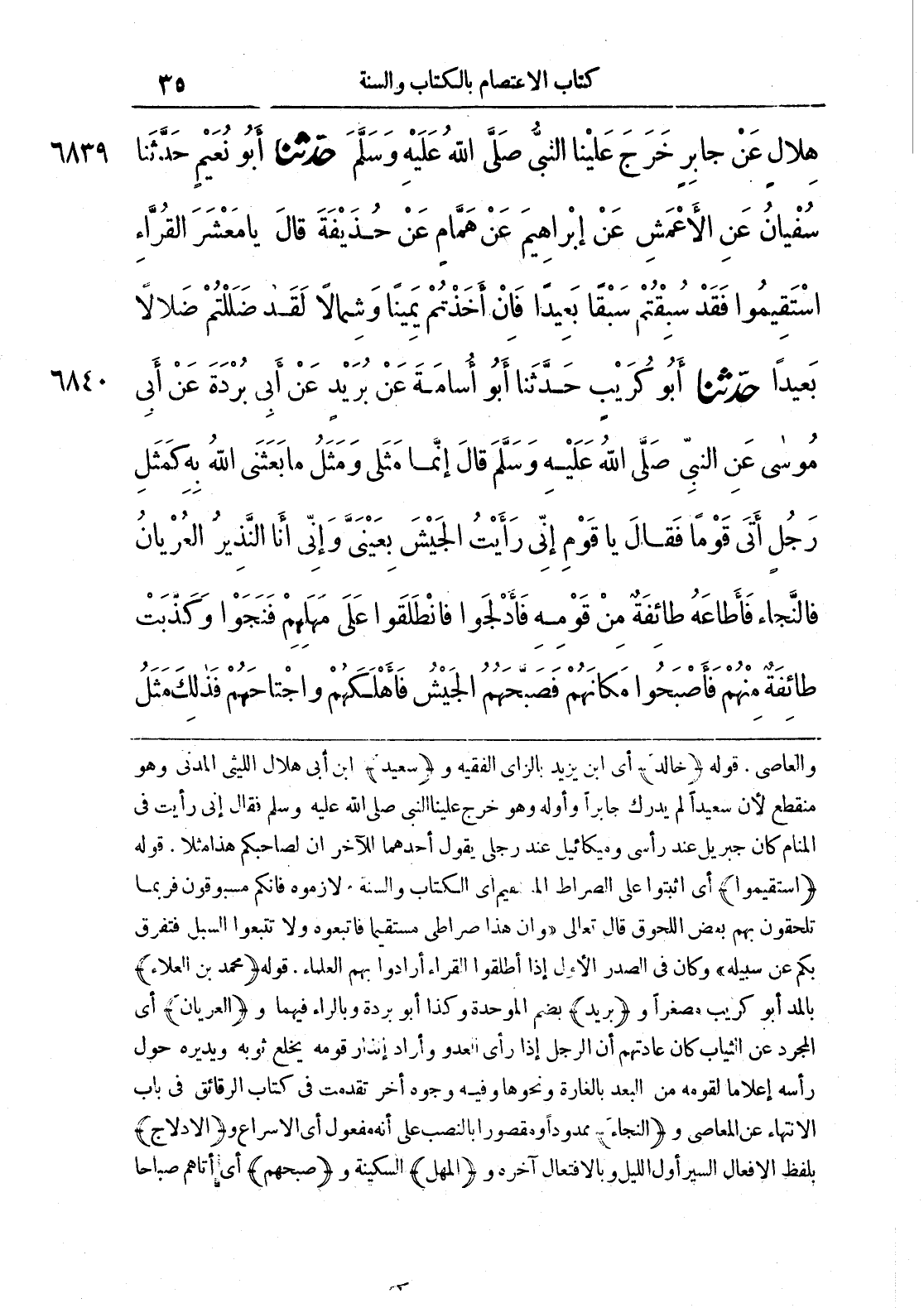 والعاصي، قوله {خالد} أي ابن يزيد بالزاي الفقيه و {سعيد} ابن أبي هلال الليثي المدني وهو منقطع لأن سعيدا لم يدرك جابرا وأوله وهو خرج علينا النبي صلى الله عليه وسلم فقال إني رأيت في المنام كان جبريل وميكائيل عند رجلي يقول أحدهما للآخر إن لصاحبكم هذا مثلا. قوله {استقيموا} أي اثبتوا على الصراط المستقيم أي الكتاب والسنة ولازموه فإنكم مسبوقون فربما تلحقون بهم بعض اللحوق قال تعالى " وإن هذا صراطي مستقيما فاتبعوه ولا تتبعوا السبل فتفرق بكم عن سبيله " وكان في الصدر الأول إذا أطلقوا القراء أرادوا بهم العلماء. قوله {محمد بن العلاء} بالمد أبو كريب مصغرا و {بريد} بضم الموحدة وكذا أبو بردة وبالراء فيهما و {العريان} أي المجرد عن الثياب كان عادتهم أن الرجل إذا رأى العدو وأراد إنذار قومه يخلع ثوبه ويديره حول رأسه إعلاما لقومه من البعد بالغارة ونحوها وفيه وجوه أخر تقدمت في كتاب الرقائق في باب الإنتهاء عن المعاصي و {النجاء} ممدودا ومقصورا بالنصب علىى أنه مفعول أيي الإسراع و {الإدلاج} بلفظ الإفعال السير أول الليل وبالافتعال آخره و {المهل} السكينة و {صبحهم} أي أتاهم صباحاً