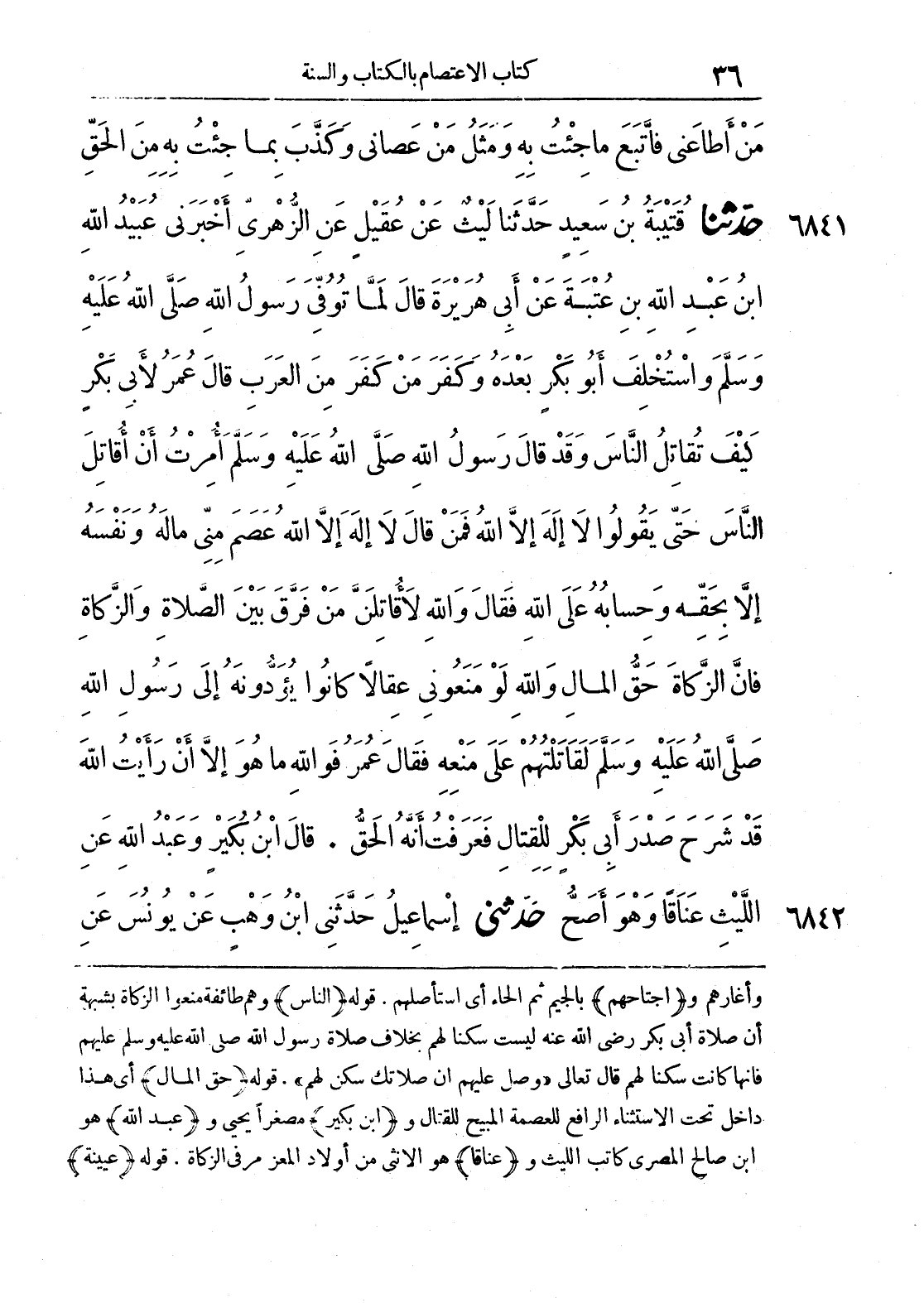 6841 - حَدَّثَنَا قُتَيْبَةُ بْنُ سَعِيدٍ حَدَّثَنَا لَيْثٌ عَنْ عُقَيْلٍ عَنْ الزُّهْرِيِّ أَخْبَرَنِي عُبَيْدُ اللَّهِ بْنُ عَبْدِ اللَّهِ بْنِ عُتْبَةَ عَنْ أَبِي هُرَيْرَةَ قَالَ لَمَّا تُوُفِّيَ رَسُولُ اللَّهِ صَلَّى اللَّهُ عَلَيْهِ وَسَلَّمَ وَاسْتُخْلِفَ أَبُو بَكْرٍ بَعْدَهُ وَكَفَرَ مَنْ كَفَرَ مِنْ الْعَرَبِ قَالَ عُمَرُ لِأَبِي بَكْرٍ كَيْفَ تُقَاتِلُ النَّاسَ وَقَدْ قَالَ رَسُولُ اللَّهِ صَلَّى اللَّهُ عَلَيْهِ وَسَلَّمَ أُمِرْتُ أَنْ أُقَاتِلَ النَّاسَ حَتَّى يَقُولُوا لَا إِلَهَ إِلَّا اللَّهُ فَمَنْ قَالَ لَا إِلَهَ إِلَّا اللَّهُ عَصَمَ مِنِّي مَالَهُ وَنَفْسَهُ إِلَّا بِحَقِّهِ وَحِسَابُهُ عَلَى اللَّهِ فَقَالَ وَاللَّهِ لَأُقَاتِلَنَّ مَنْ فَرَّقَ بَيْنَ الصَّلَاةِ وَالزَّكَاةِ فَإِنَّ الزَّكَاةَ حَقُّ الْمَالِ وَاللَّهِ لَوْ مَنَعُونِي عِقَالًا كَانُوا يُؤَدُّونَهُ إِلَى رَسُولِ اللَّهِ صَلَّى اللَّهُ عَلَيْهِ وَسَلَّمَ لَقَاتَلْتُهُمْ عَلَى مَنْعِهِ فَقَالَ عُمَرُ فَوَاللَّهِ مَا هُوَ إِلَّا أَنْ رَأَيْتُ اللَّهَ قَدْ شَرَحَ صَدْرَ أَبِي بَكْرٍ لِلْقِتَالِ فَعَرَفْتُ أَنَّهُ الْحَقُّ. قَالَ ابْنُ بُكَيْرٍ وَعَبْدُ اللَّهِ عَنْ اللَّيْثِ عَنَاقًا وَهُوَ أَصَحُّ