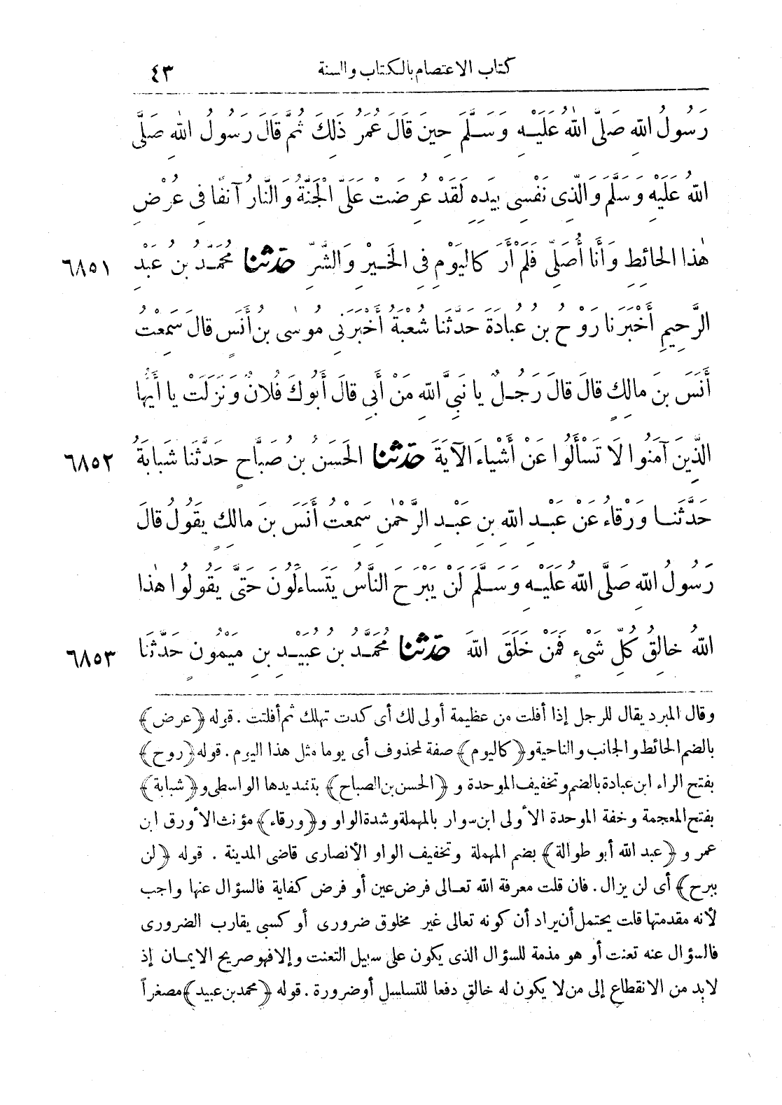6852 - حَدَّثَنَا الْحَسَنُ بْنُ صَبَّاحٍ حَدَّثَنَا شَبَابَةُ حَدَّثَنَا وَرْقَاءُ عَنْ عَبْدِ اللَّهِ بْنِ عَبْدِ الرَّحْمَنِ سَمِعْتُ أَنَسَ بْنَ مَالِكٍ يَقُولُ قَالَ رَسُولُ اللَّهِ صَلَّى اللَّهُ عَلَيْهِ وَسَلَّمَ لَنْ يَبْرَحَ النَّاسُ يَتَسَاءَلُونَ حَتَّى يَقُولُوا هَذَا اللَّهُ خَالِقُ كُلِّ شَيْءٍ فَمَنْ خَلَقَ اللَّهَ