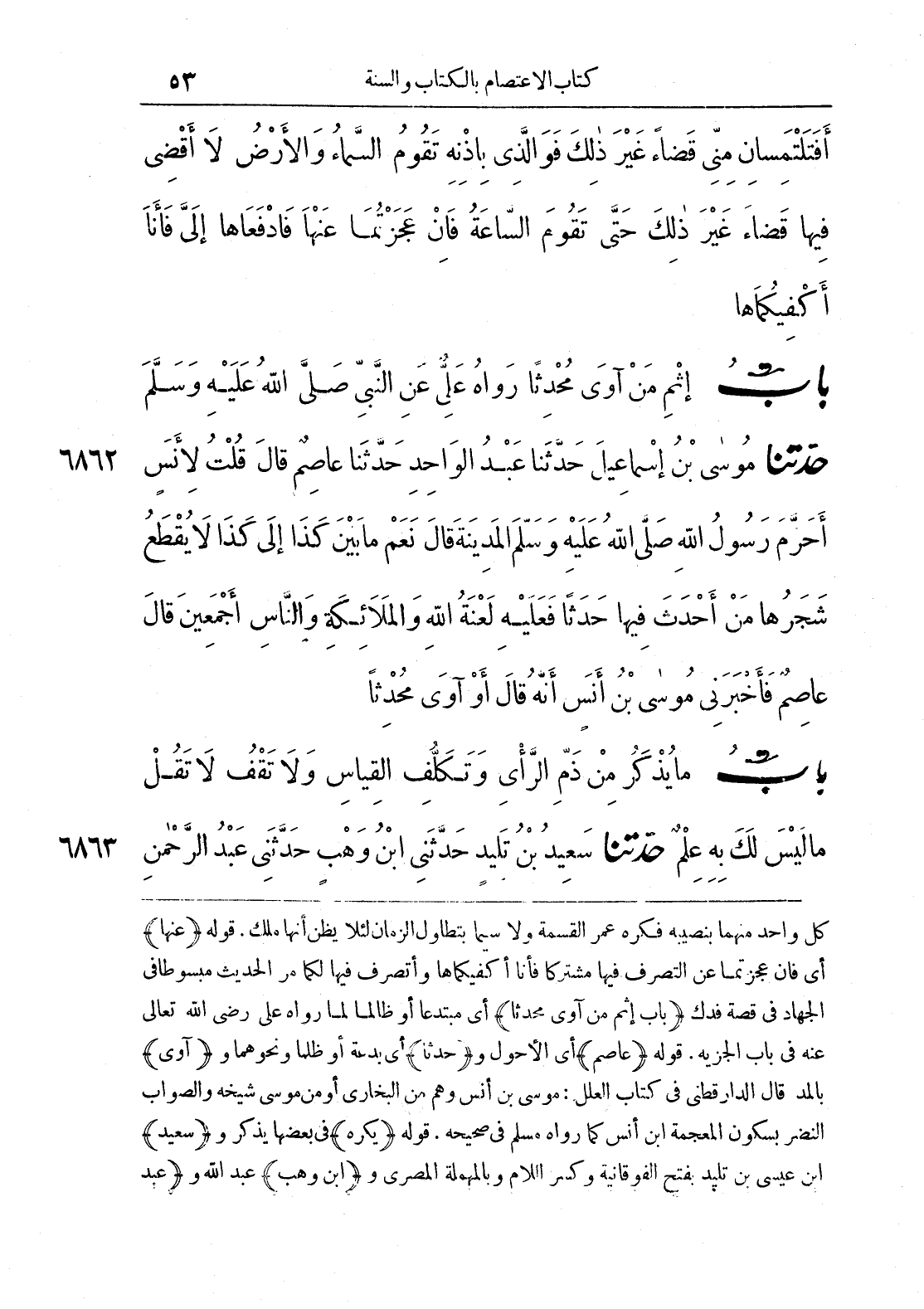 كل واحد منهما بنصيبه فكره عمر القسمة ولا سيما بتطاول الزمن لئلا يظن أنها مللك. قوله {عنها} أي فإن عجزتما عن التصرف فيها مشتركا فأنا أكفيكماها وأتصرف فيها لكما مر الحديث مبسوطا في الجهاد في قصة فدك. {باب إثم من أوى محدثا} أي مبتدعا أو ظالما لما رواه علي رضي الله تعالى عنه في باب الجزية. قوله {عاصم} أي الأحول و {حدثا} أي بدعة أو ظلم ونحوهما و {آوى} بالمد قال الدارقطني في كتاب العلل: موسى بن أنس وهم من البخاري أو من موسى شيخه والصواب النضر بسكون المعجمة ابن أنس كما رواه مسلم في صحيحه. {باب ما يذكر من ذم الرأي وتكلف القياس} قوله {يكره} في بعضها يذكر و {سعيد} ابن عيسى بن تليد بفتح الفوقانية وكسر اللام وبالمهملة المصري و {ابن وهب} عبد الله و {عبد