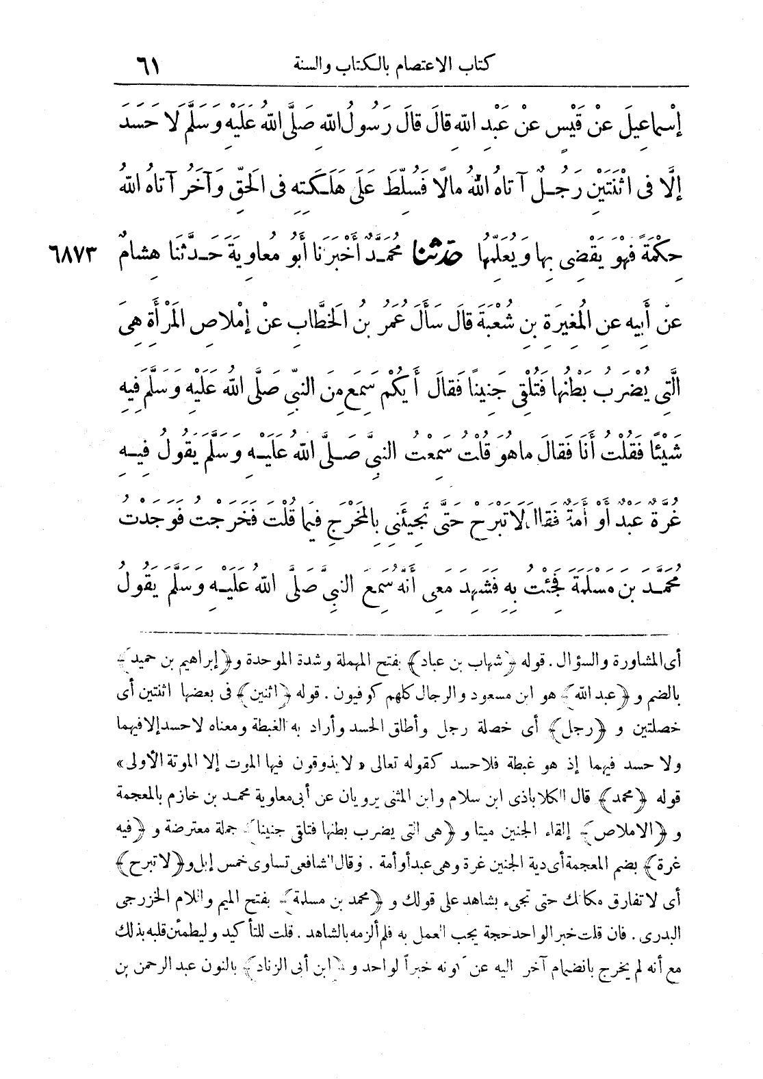 أي المشاورة والسؤال، قوله {شهاب بن عباد} بفتح المهملة وشدة الموحدة و {إبراهيم بن حميد} بالضم و {عبد الله} هو ابن مسعود والرجال كلهم كوفيون. قوله {اثنين} في بعضها اثنتين أي خصلتين و {رجل} أي خصلة رجل وأطلق الحسد وأراد به الغبطة ومعناه لاحسد إلا فيهما ولا حسد فيهما إذ هو غبطة فلا حسد كقوله تعالى " لا يذوقون فيها الموت إلا الموتة الأولى ".قوله {محمد} قال الكلاباذي ابن سلام وابن المثنى يرويان عن أبي معاوية محمد بن خازم بالمعجمة و {الإملاص} إلقاء الجنين ميتا و {هي التي يضرب بطنها فتلقي جنينا} جملة معترضة و {فيه غرة} بضم المعجمة أي دية الجنين غرة وهي عبد أو أمة. وقال الشافعي تساوي خمس إبل و {لا تبرح} أي لا تفارق مكانك حتى تجيء بشاهد على قولك و {محمد بن مسلمة} بفتح الميم واللام الخزرجي البدري، فإن قلت خبر الواحد حجة يجب العمل به فلم ألزمه بالشاهد. قلت للتأكيد وليطمئن قلبه بذلك مع أنه لم يخرج بانضمام آخر إليه عن كونه خبرا لواحد و {ابن أبي الزناد} بالنون عبد الرحمن بن