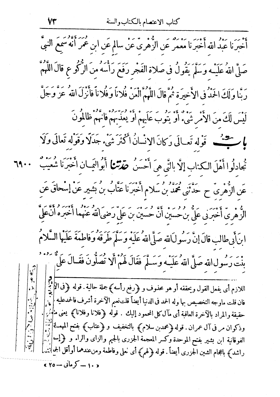 اللازم أي يفعل القول ويحققه أو هو محذوف و {رفع رأسه} جملة حالية، قوله {في الآية} فإن قلت ما وجه التخصيص بها وله الحمد في الدنيا أيضا قلت نعيم الآخرة أشرف فالحمد عليه هو حقيقة والمراد بالآخرة العاقبة أي مآل كل المحمود إليك. قوله {فلانا وفلان} يعني [غير واضح] وذكوان مر في آل عمران. {باب قوله تعالى وكان الإنسان أكثر شيء جدلا} قوله {محمد بن سلام} بالتخفيف و {عتاب} بفتح المهملة الفوقانية ابن بشير بفتح الموحدة وكسر المعجمة الجرزي بالجيم والزاي والراء و {إسحاق بن راشد} بإعجام الشين الجزري أيضا، قوله {لهم} أي علي وفاطمة من عندهما أو أقل الجمع