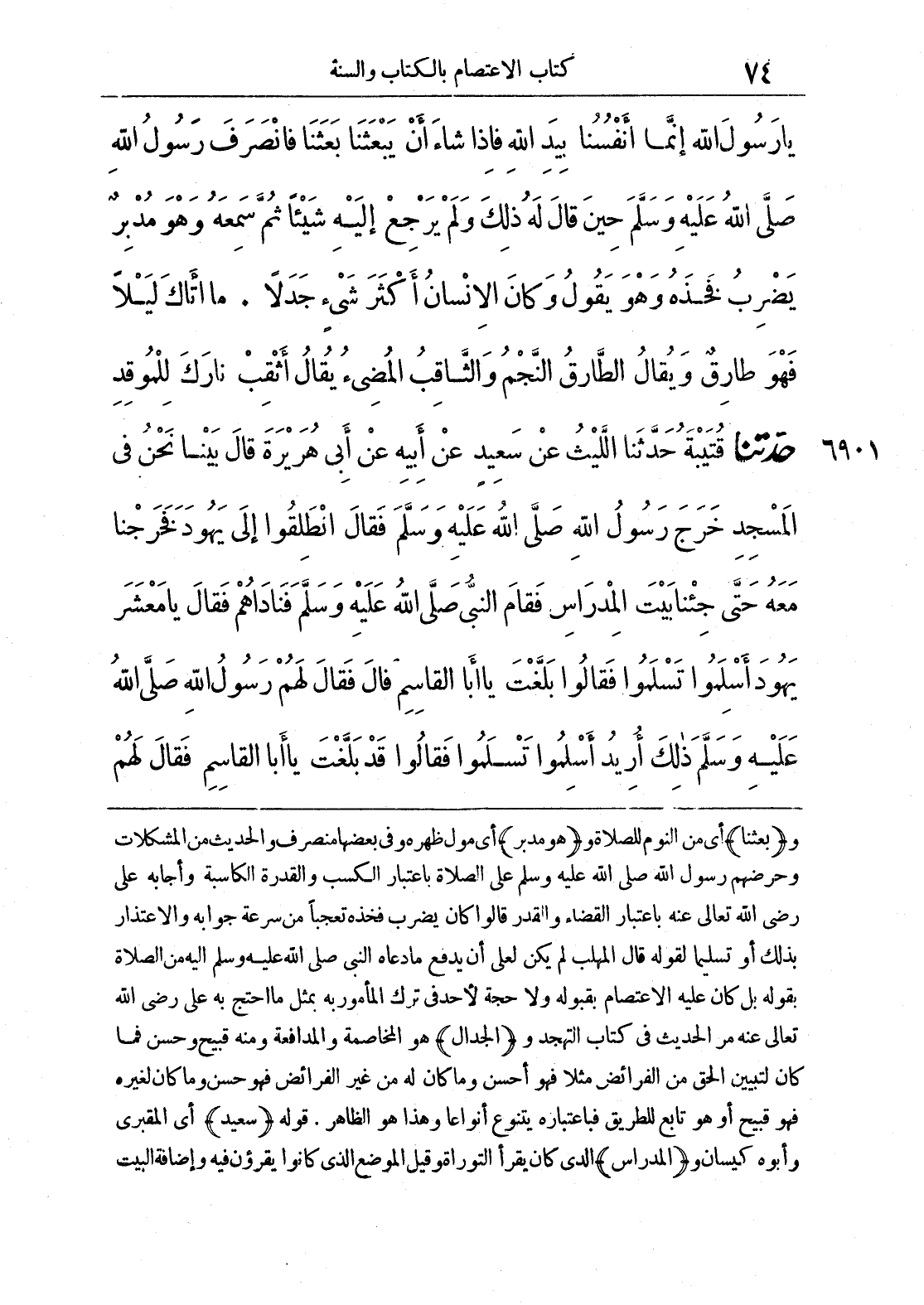 6901 - حَدَّثَنَا قُتَيْبَةُ حَدَّثَنَا اللَّيْثُ عَنْ سَعِيدٍ عَنْ أَبِيهِ عَنْ أَبِي هُرَيْرَةَ قَالَ بَيْنَا نَحْنُ فِي الْمَسْجِدِ خَرَجَ رَسُولُ اللَّهِ صَلَّى اللَّهُ عَلَيْهِ وَسَلَّمَ فَقَالَ انْطَلِقُوا إِلَى يَهُودَ فَخَرَجْنَا مَعَهُ حَتَّى جِئْنَا بَيْتَ الْمِدْرَاسِ فَقَامَ النَّبِيُّ صَلَّى اللَّهُ عَلَيْهِ وَسَلَّمَ فَنَادَاهُمْ فَقَالَ يَا مَعْشَرَ يَهُودَ أَسْلِمُوا تَسْلَمُوا فَقَالُوا قَدْ بَلَّغْتَ يَا أَبَا الْقَاسِمِ قَالَ فَقَالَ لَهُمْ رَسُولُ اللَّهِ صَلَّى اللَّهُ عَلَيْهِ وَسَلَّمَ ذَلِكَ أُرِيدُ أَسْلِمُوا تَسْلَمُوا فَقَالُوا قَدْ بَلَّغْتَ يَا أَبَا الْقَاسِمِ فَقَالَ لَهُمْ