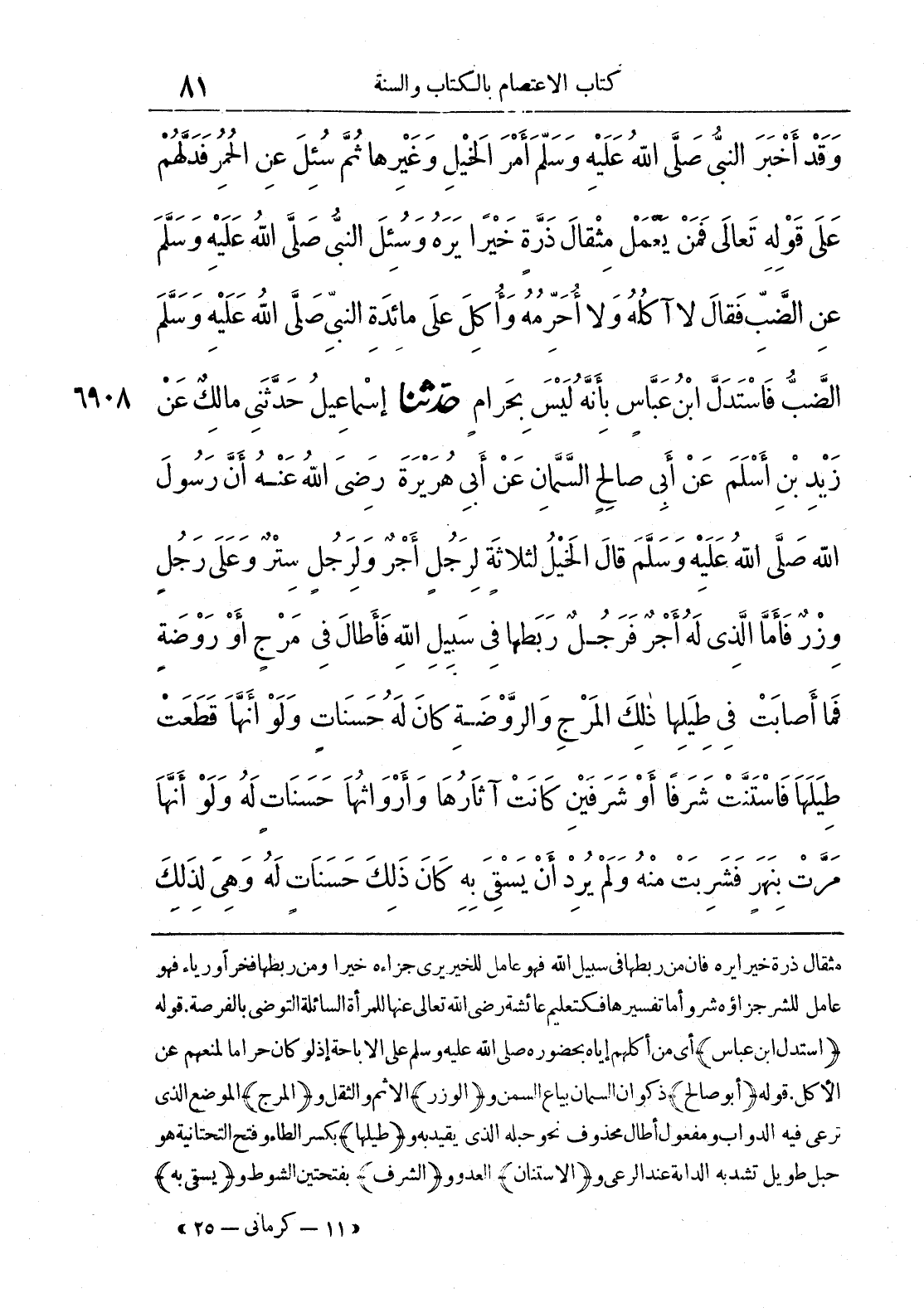 مثقال ذرة خيرا يره فإن من ربطها في سبيل الله فهو عامل للخير يرى جزاءه خيرا ومن ربطها فخرا أو رياء فهو عامل للشر جزاؤه شر وأما تفسيرها فكتعليم عائشة رضي الله عنها للمرة السائلة التوضي بالفرصة، قوله {استدل ابن عباس} أي من أكلهم إياه بحضوره صلى الله عليه وسلم على الإباحة إذ لو كان حراما لمنعهم عن الأكل. قوله {أبو صالح} ذكوان السمان بائع السمن و {الوزر} الإثم والثقل و {المرج} الموضع الذي ترعى فيه الدواب ومفعول أطال محذوف نحو حبله الذي يقيد به و {طيلها} بكسر الطاء وفتح التحتانية هو حبل طويل تشد به الدابة عند الرعي و {الاستنان} العدو و {الشرف} بفتحتين الشوط و {يسقي به}