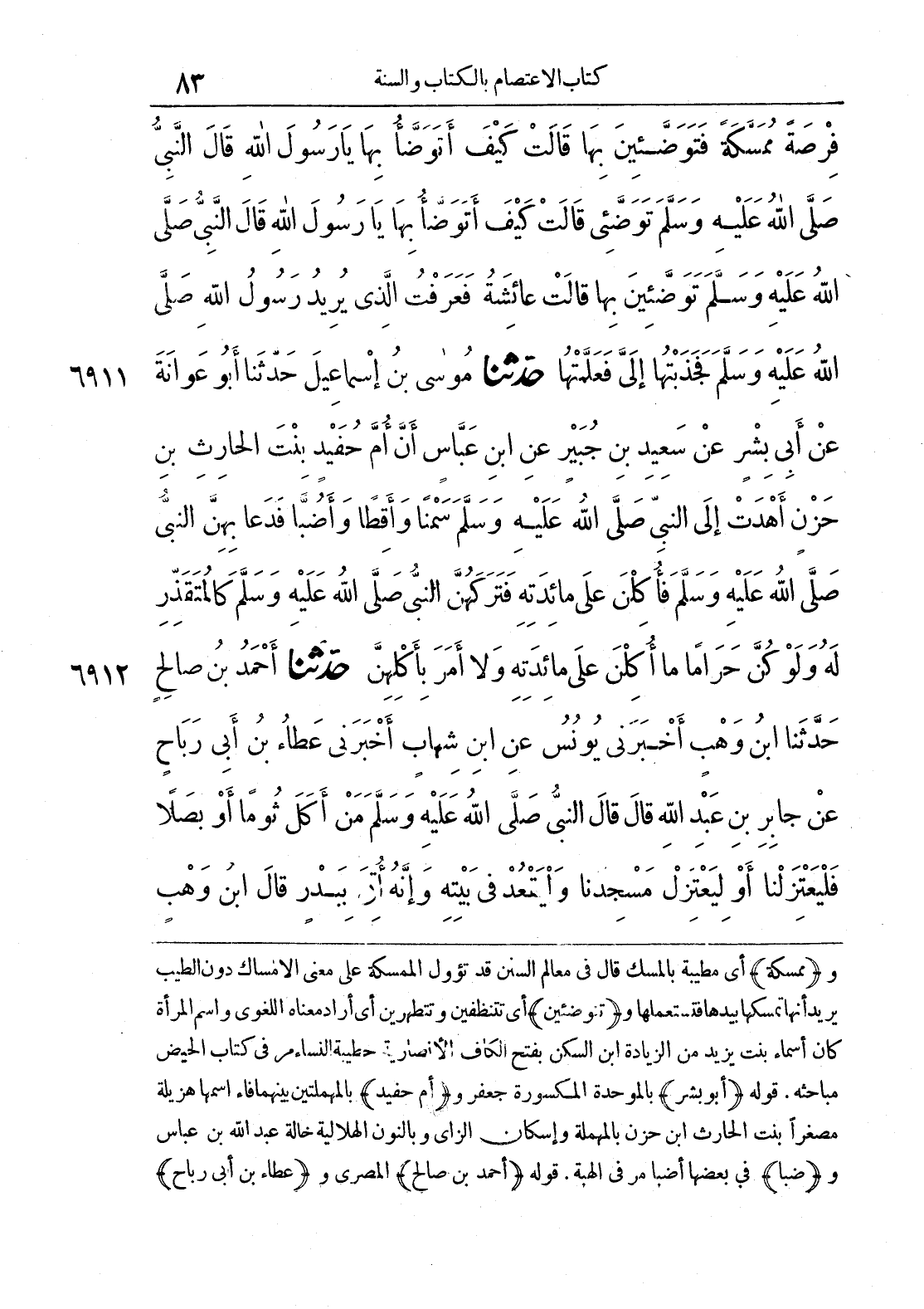 و {ممسكة} أي مطيبة بالمسك قال في معالم السنن قد تؤول الممسكة على معنى الإمساك دون الطيب يريد بها أنها تمسك بيدها فتستعملها و {تتوضئين} أي تتنظفين وتطهرين أي أراد معناه اللغوي واسم المرأة كان أسماء بنت يزيد من الزيادة ابن السكن بفتح الكاف الأنصارية خطيبة النساء مر في كتاب الحيض مباحثه. قوله {أبو بشر} بالموحدة المكسورة جعفر و {أم حفيد} بالمهملتين بينهما فاء اسمها هزيلة مصغرا بنت الحارث ابن حزن بالمهملة وإسكان الزاي وبالنون الهلالية خالة عبد الله بن عباس و {ضبا} في بعضها أضبا مر في الهبة. قوله {أحمد بن صالح} المصري و {عطاء بن أبي رباح}