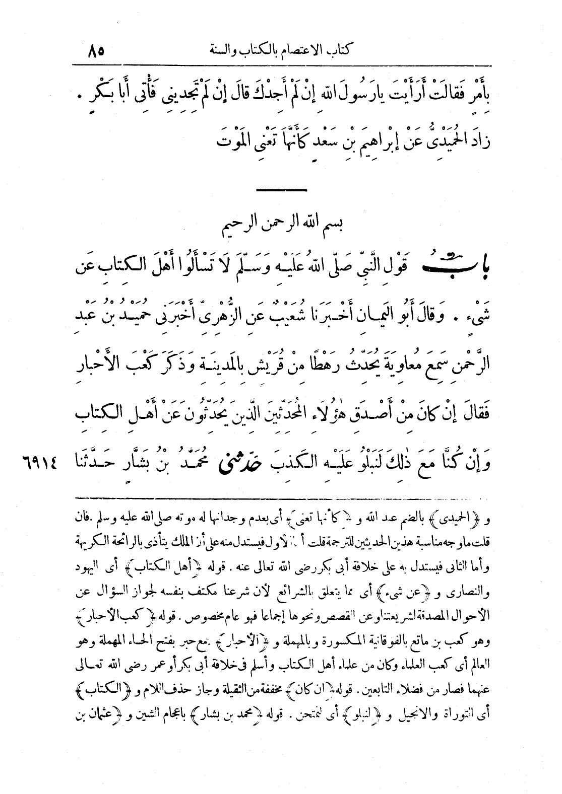 و {الحميدي} بالضم عبد الله و {كأنها تعني} أي بعدم وجدانها له موته صلى الله عليه وسلم، فإن قلت ما وجه مناسبة هذين الحديثين للترجمة قلت أن الأول فيستدل منه على أن الملك يتأذى بالرائحة الكريهة وأما الثاني فيستدل به على خلافة أبي بكر رضي الله تعالى عنه. {باب قول النبي صلى الله عليه وسلم لا تسألوا أهل الكتاب عن شيء} قوله {أهل الكتاب} أي اليهود والنصارى و {عن شيء} أي مما يتعلق بالشرائع لأن شرعنا مكتف بنفسه لجواز السؤال عن الأحوال المصدقة لشريعتنا وعن القصص ونحوها إجماعا فهو عام مخصوص. قوله {كعب الأحبار} وهو كعب بن مانع بالفوقانية المكسورة وبالمهملة و {الأحبار} جمع حبر بفتح الحاء المهملة وهو العالم أي كعب العلماء وكان من علماء أهل الكتاب وأسلم في خلافة أبي بكر الصديق أو عمر رضي الله تعالى عنهما فصار من فضلاء التابعين. قوله {إن كان} مخففة من الثقيلة وجاز حذف اللام و {الكتاب} أي التوراة والإنجيل و {لنبلو} أي لنمتحن. قوله {محمد بن بشار} بإعجام الشين و {عثمان بن