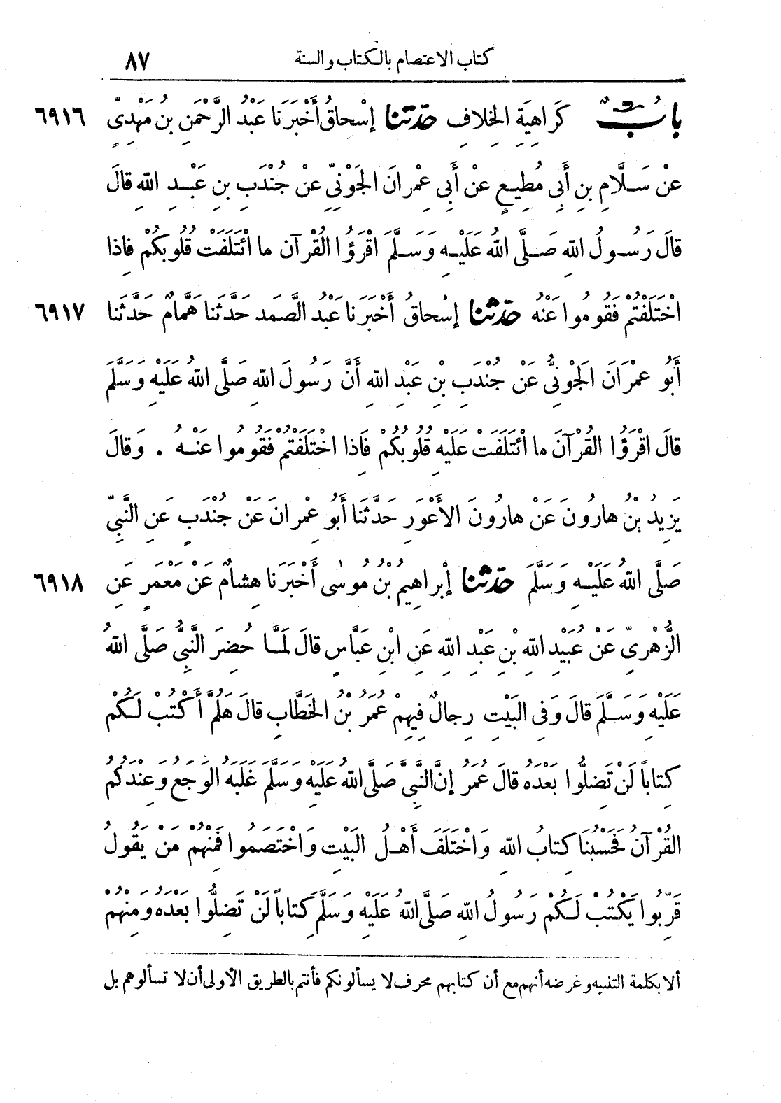 6918 - حَدَّثَنَا إِبْرَاهِيمُ بْنُ مُوسَى أَخْبَرَنَا هِشَامٌ عَنْ مَعْمَرٍ عَنْ الزُّهْرِيِّ عَنْ عُبَيْدِ اللَّهِ بْنِ عَبْدِ اللَّهِ عَنْ ابْنِ عَبَّاسٍ قَالَ لَمَّا حُضِرَ النَّبِيُّ صَلَّى اللَّهُ عَلَيْهِ وَسَلَّمَ قَالَ وَفِي الْبَيْتِ رِجَالٌ فِيهِمْ عُمَرُ بْنُ الْخَطَّابِ قَالَ هَلُمَّ أَكْتُبْ لَكُمْ كِتَابًا لَنْ تَضِلُّوا بَعْدَهُ قَالَ عُمَرُ إِنَّ النَّبِيَّ صَلَّى اللَّهُ عَلَيْهِ وَسَلَّمَ غَلَبَهُ الْوَجَعُ وَعِنْدَكُمْ الْقُرْآنُ فَحَسْبُنَا كِتَابُ اللَّهِ وَاخْتَلَفَ أَهْلُ الْبَيْتِ وَاخْتَصَمُوا فَمِنْهُمْ مَنْ يَقُولُ قَرِّبُوا يَكْتُبْ لَكُمْ رَسُولُ اللَّهِ صَلَّى اللَّهُ عَلَيْهِ وَسَلَّمَ كِتَابًا لَنْ تَضِلُّوا بَعْدَهُ وَمِنْهُمْ