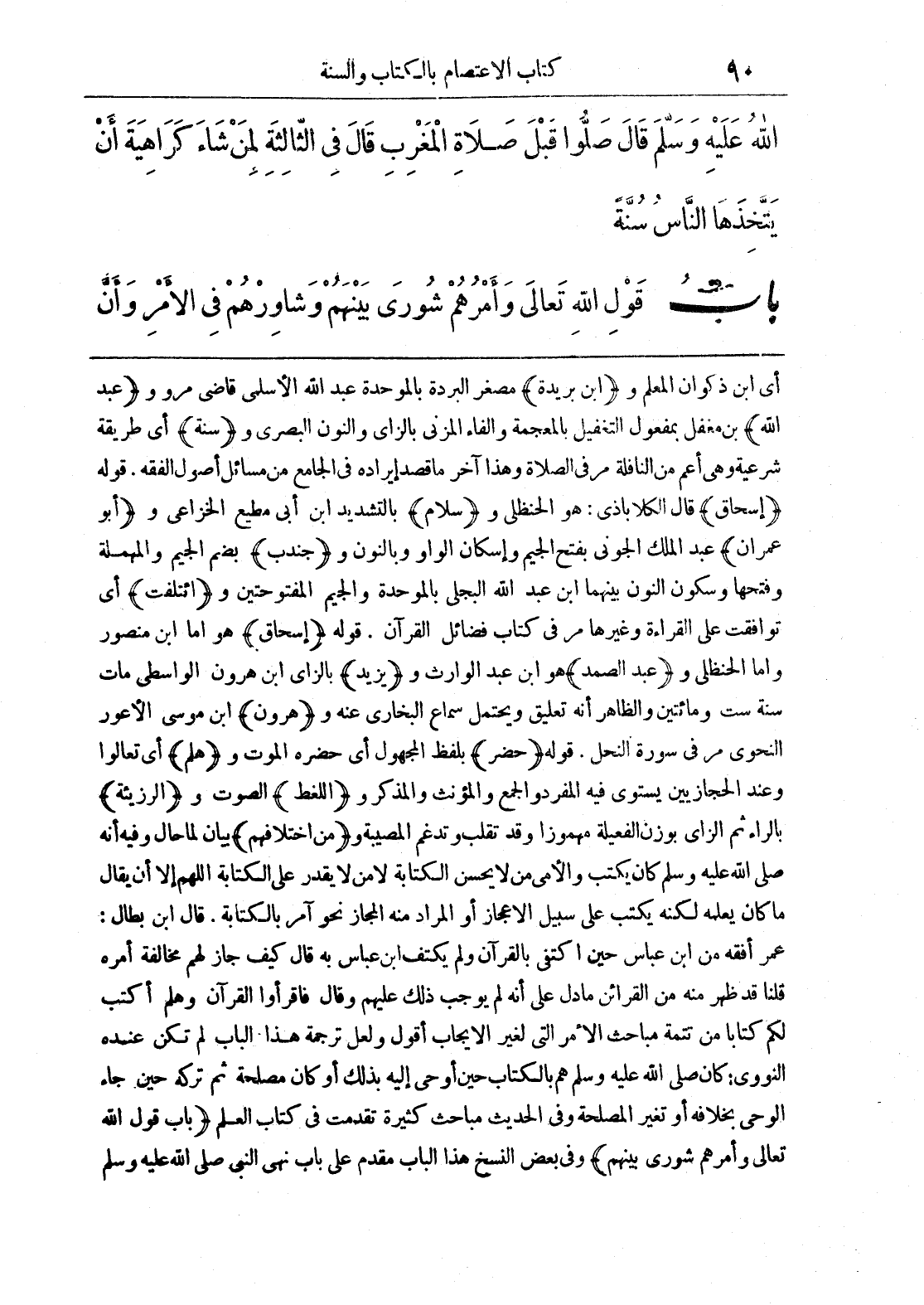 أي ابن ذكوان المعلم و {ابن بريدة} مصغر البردة بالموحدة عبد الله الأسلمي قاضي مرو و {عبد الله} بن مغفل بمفعول التغفيل بالمعجمة والفاء المزني بالزاي والنون البصري و {سنة} أي طريقة شرعية وهي أعم من النافلة مر في الصلاة وهذا آخر ما قصد إيراده في الجامع من مسائل أصول الفقه. قوله {إسحاق} قال الكلاباذي: هو الحنظلي و {سلام} بالتشديد ابن أبي مطيع الخزاعي و {أبو عمران} عبد الملك الجوني بفتح الجيم وإسكان الواو وبالنون و {جندب} بضم الجيم والمهملة وفتحها وسكون النون بينهما ابن عبد الله البجلي بالموحدة والجيم المفتوحتين و {ائتلفت} أي توافقت على القراءة وغيرها مر في كتاب فضائل القرآن. قوله {إسحاق} هو إما ابن منصور وإما الحنظلي و {عبد الصمد} هو ابن عبد الوارث و {يزيد} بالزاي ابن هرون الواسطي مات سنة ست ومائتين والظاهر أنه تعليق ويحتمل سماع البخاري عنه و {هرون} ابن موسى الأعور النحوي مر في سورة النحل. قوله {حضر} بلفظ المجهول أي حضره الموت و {هلم} أي تعالوا وعند الحجازيين يستوي فيه المفرد والجمع والمؤنث والمذكر و {اللغط} الصوت و {الرزيئة} بالراء ثم الزاي بوزن الفعيلة مهموزا وقد تقلب وتدغم المصيبة و {من اختلافهم} بيان لما حال وفيه أنه صلى الله عليه وسلم كان يكتب والأمي من لا يحسن الكتابة لا من لايقدر على الكتابة اللهم إلا أن يقال ما كان يعلمه لكنه يكتب على سبيل الإعجاز أو المراد منه المجاز نحو آمر بالكتابة. قال ابن بطال: عمر أفقه من ابن عباس حين اكتفى بالقرآن ولم يكتف ابن عباس به قال كيف جاز لهم مخالفة أمره قلنا قد ظهر منه من القرائن ما دل على أنه لم يوجب ذلك عليهم وقال فاقرأوا القرآن وهلم أكتب لكم كتابا من تتمة مباحث الأمر التي لغير الإيجاب أقول ولعل ترجمة هذا الباب لم تكن عنده النووي: كان صلى الله عليه وسلم هم بالكتاب حين أوحي إليه بذلك أو كان مصلحة ثم تركه حين جاء الوحي بخلافه أو تغير المصلحة وفي الحديث مباحث كثيرة تقدمت في كتاب العلم، {باب قول الله تعالى وأمرهم شورى بينهم} وفي بعض النسخ هذا الباب مقدم على باب نهي النبي صلى الله عليه وسلم