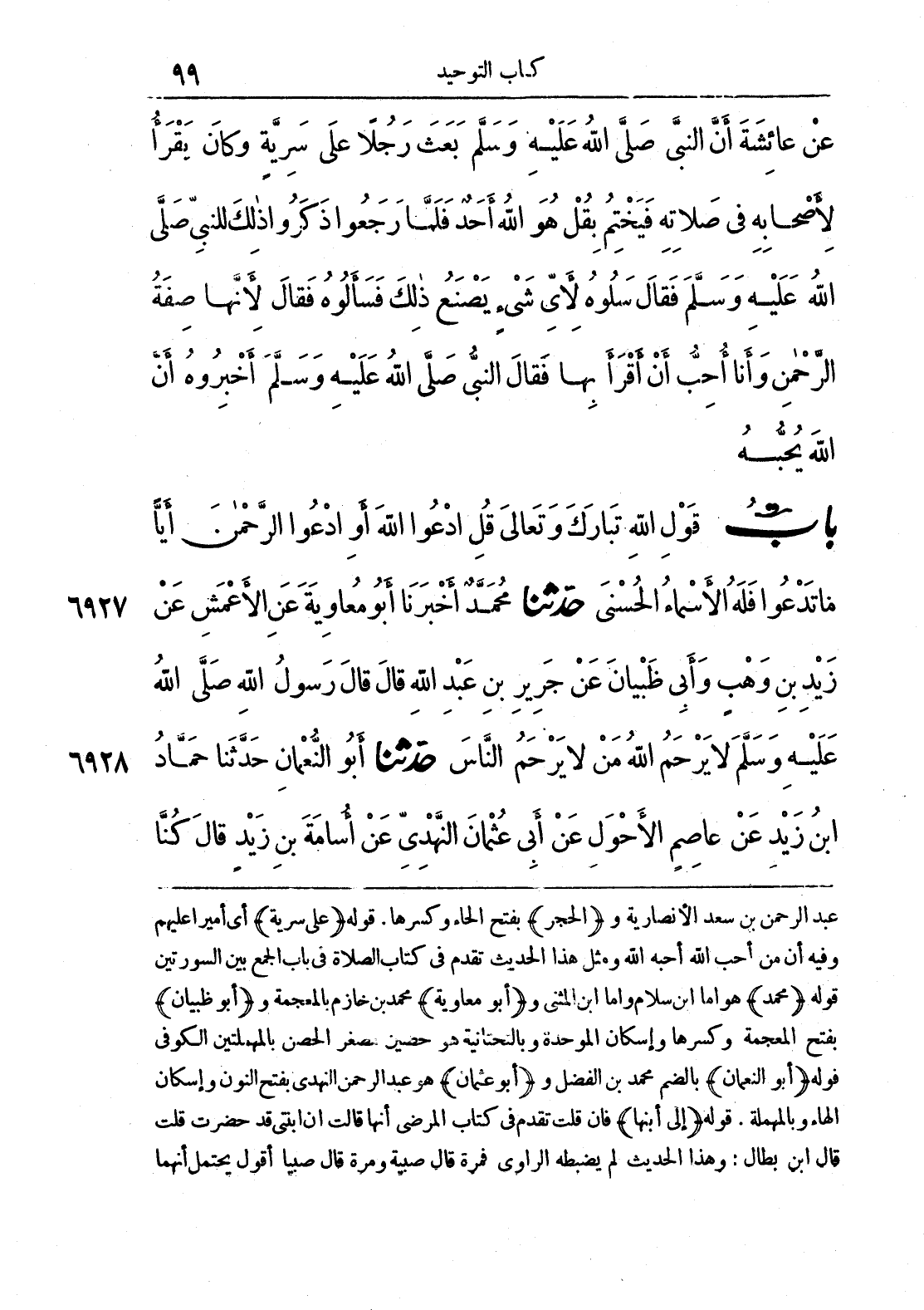 عبد الرحمن بن سعد الأنصارية و {الحجر} بفتح الحاء وكسرها. قوله {على سرية} أي أميرا عليهم وفيه أن من أحب الله أحبه الله ومثل هذا الحديث تقدم في كتاب الصلاة في باب الجمع بين السورتين. {باب قول الله تبارك وتعالى قل ادعوا الله أو ادعوا الرحمن} قوله {محمد} هو إما ابن سلام وإما ابن المثنى و {أبو معاوية} محمد بن خازم بالمعجمة و {أبو ضبيان} بفتح المعجمة وكسرها وإسكان الموحدة وبالتحتانية هو حصين مصغر الحصن بالمهملتين الكوفي. قوله {أبو النعمان} بالضم محمد بن الفضل و {أبو عثمان} هو عبد الرحمن النهدي بفتح النون وإسكان الهاء وبالمهملة، قوله {إلى ابنها} فإن قلت تقدم في كتاب المرضى أنها قالت أن ابنتي قد حضرت قلت قال ابن بطال: وهذا الحديث لم يضبطه الراوي فمرة قال صبية ومرة قال صبيا أقول يحتمل أنهما
