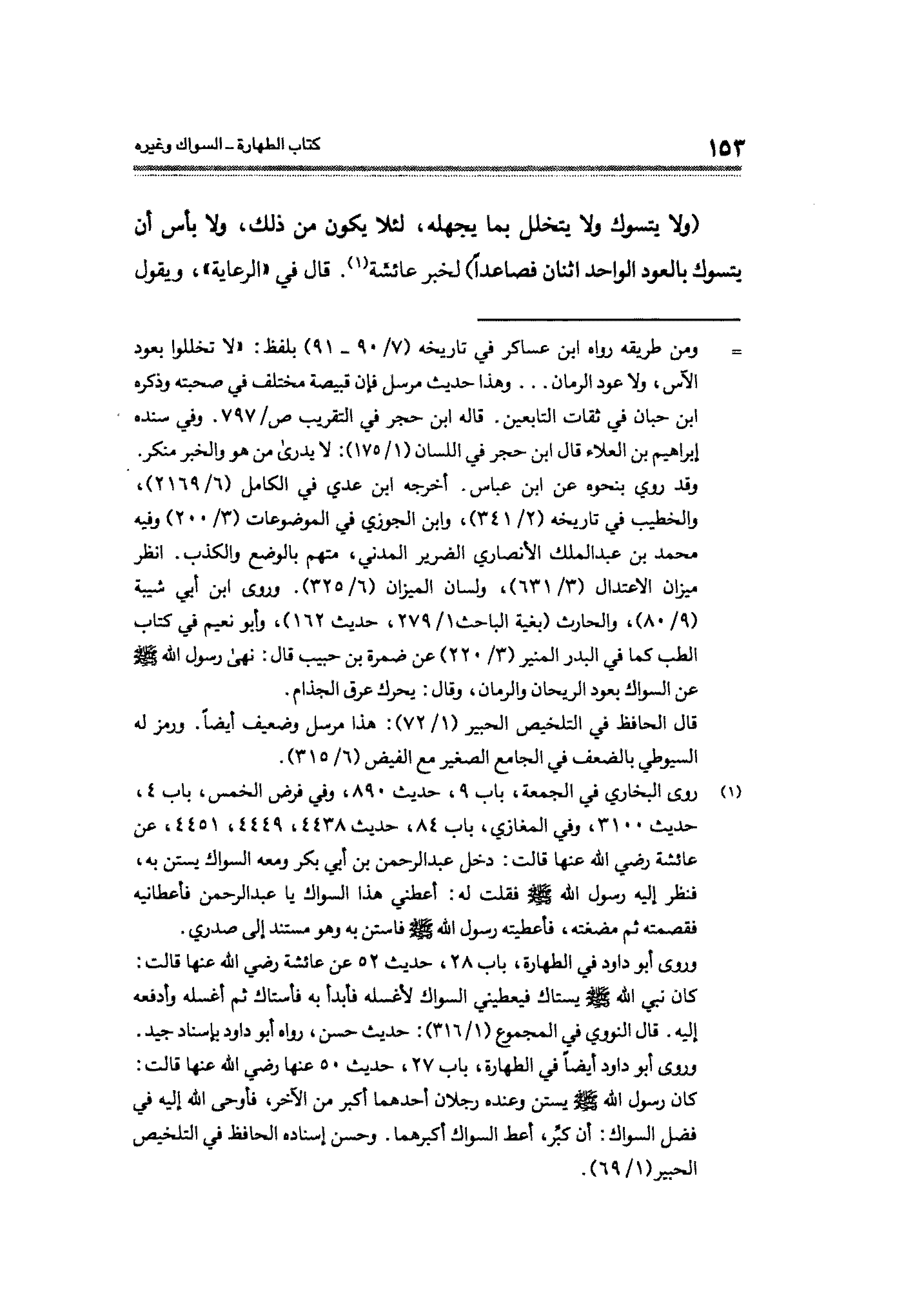 وروى أبو داود في الطهارة، باب ٢٨، حديث ٥٢ عن عائشة رضي الله عنها قالت: كان نبي الله - صلى الله عليه وسلم - يستاك فيعطيني السواك لأغسله فأبدأ به فأستاك ثم أغسله وأدفعه إليه. قال النووي في المجموع (١/ ٣١٦): حديث حسن، رواه أبو داود بإسناد جيد. وروى أبو داود أيضًا في الطهارة، باب ٢٧، حديث ٥٠ عنها رضي الله عنها قالت: كان رسول الله - صلى الله عليه وسلم - يستن وعنده رجلان أحدهما أكبر من الآخر، فأوحى الله إليه في فضل السواك: أن كبِّر، أعط السواك أكبرهما. وحسن إسناده الحافظ في التلخيص الحبير (١/ ٦٩).