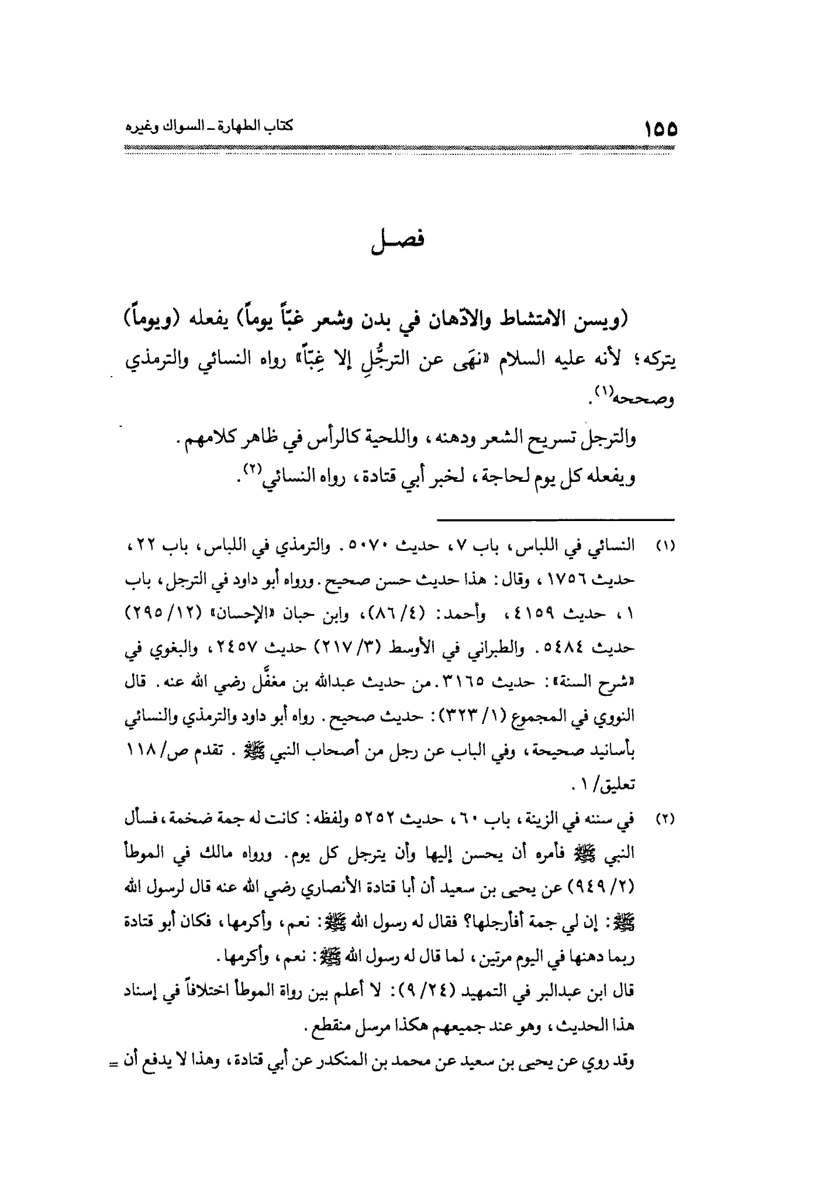 (ويسن الامتشاط والادّهان في بدن وشعر غبًّا يومًا) يفعله (ويومًا) يتركه؛ لأنه - عليه السلام - "نهَى عن الترجُّلِ إلا غبًّا" رواه النسائي والترمذي وصححه (¬١).