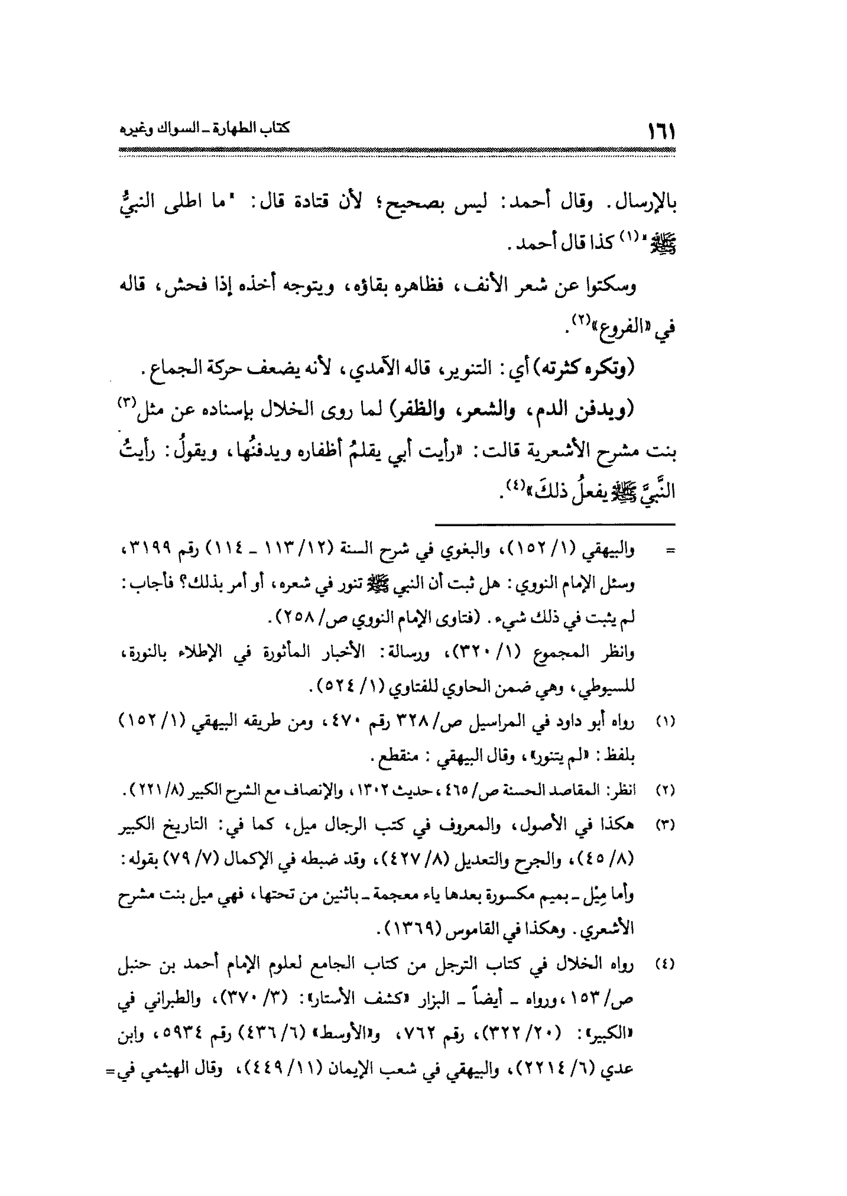 = والبيهقي (١/ ١٥٢)، والبغوي في شرح السنة (١٢/ ١١٣ - ١١٤) رقم ٣١٩٩، وسئل الإمام النووي: هل ثبت أن النبي - صلى الله عليه وسلم - تنور في شعره، أو أمر بذلك؟ فأجاب: لم يثبت في ذلك شيء. (فتاوى الإمام النووي ص / ٢٥٨).