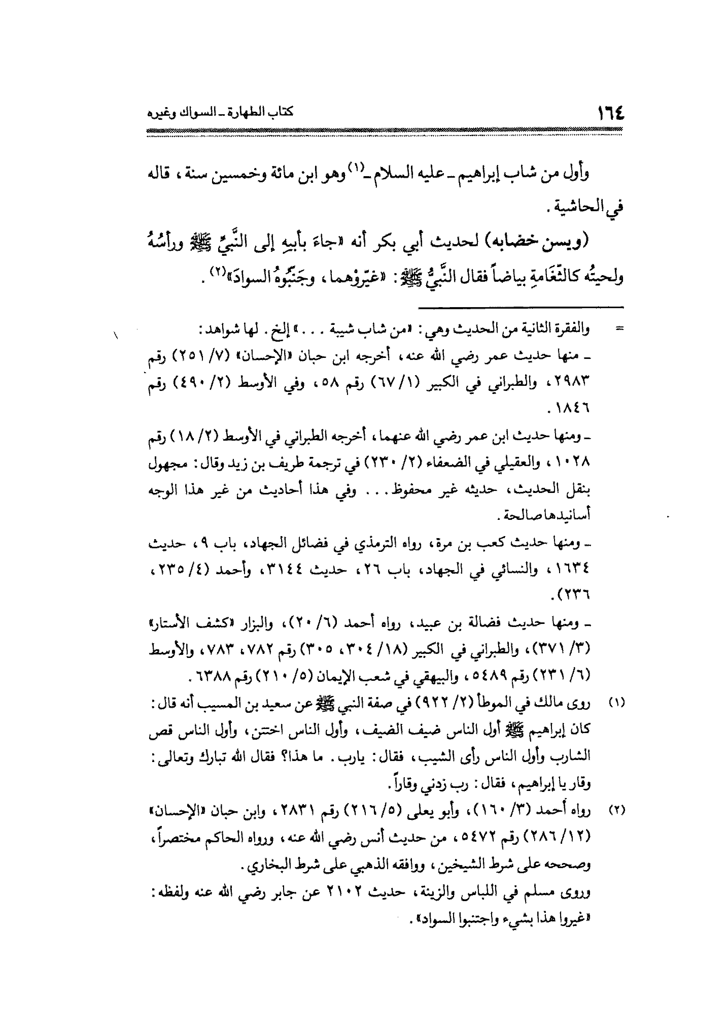 (¬١) روى مالك في الموطأ (٢/ ٩٢٢) في صفة النبي - صلى الله عليه وسلم - عن سعيد بن المسيب أنه قال: كان إبراهيم - صلى الله عليه وسلم - أول الناس ضيف الضيف، وأول الناس اختتن، وأول الناس قص الشارب وأول الناس رأى الشيب، فقال: يا رب. ما هذا؟ فقال الله تبارك وتعالى: وقار يا إبراهيم، فقال: رب زدني وقارًا.