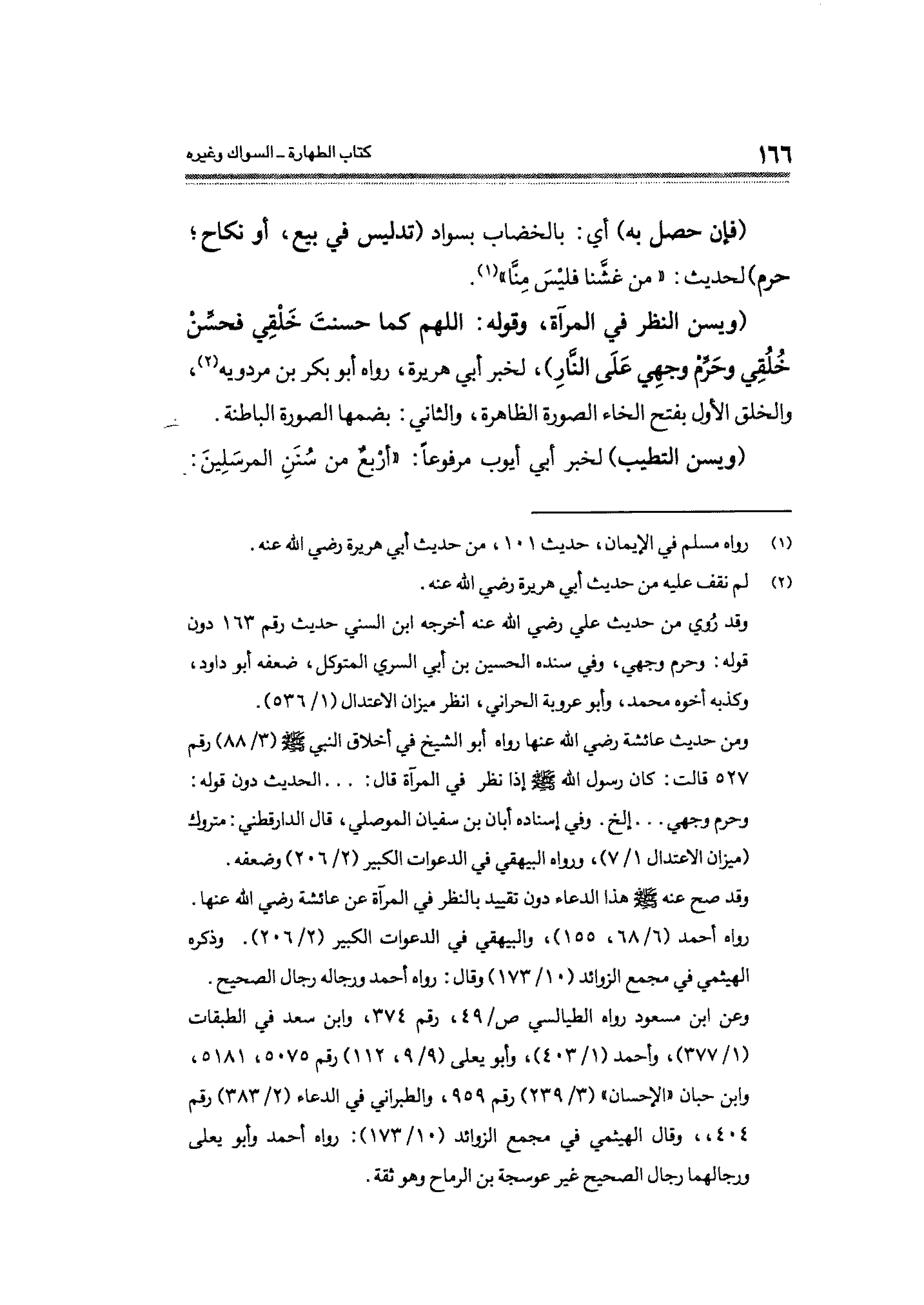 (ويسن النظر في المرآة، وقوله: اللهم كما حسنتَ خَلْقِي فحسِّنْ خُلُقِي وحَرِّم وجهِي عَلَى النَّارِ)، لخبر أبي هريرة، رواه أبو بكر بن مردويه (¬٢)، والخلق الأول بفتح الخاء الصورة الظاهرة، والثاني: بضمها الصورة الباطنة.