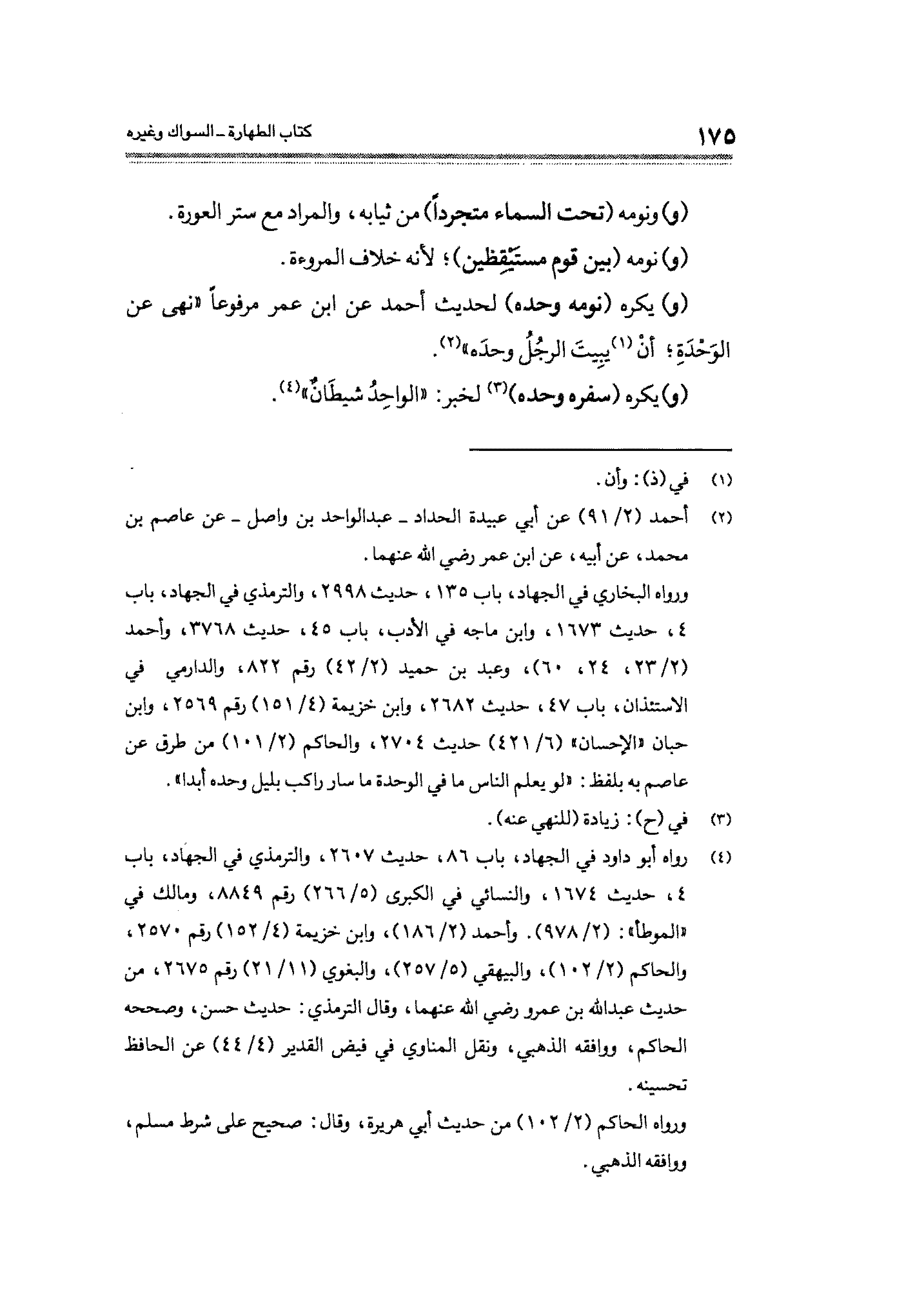 ورواه البخاري في الجهاد، باب ١٣٥، حديث ٢٩٩٨، والترمذي في الجهاد، باب ٤، حديث ١٦٧٣، وابن ماجه في الأدب، باب ٤٥، حديث ٣٧٦٨، وأحمد (٣/ ٣٣، ٢٤، ٦٠)، وعبد بن حميد، (٢/ ٤٢) رقم:٨٢٢؛ والدارمي في الاستئذان، باب ٤٧، حديث ٢٦٨٢، وابن خزيمة (٤/ ١٥١) رقم ٢٥٦٩، وابن حبان "الإحسان" (٦/ ٤٢١) حديث ٢٧٠٤، والحاكم (٢/ ١٠١) من طرق عن عاصم به بلفظ: "لو يعلم الناس ما في الوحدة ما سار راكب بليل وحده أبدا".
