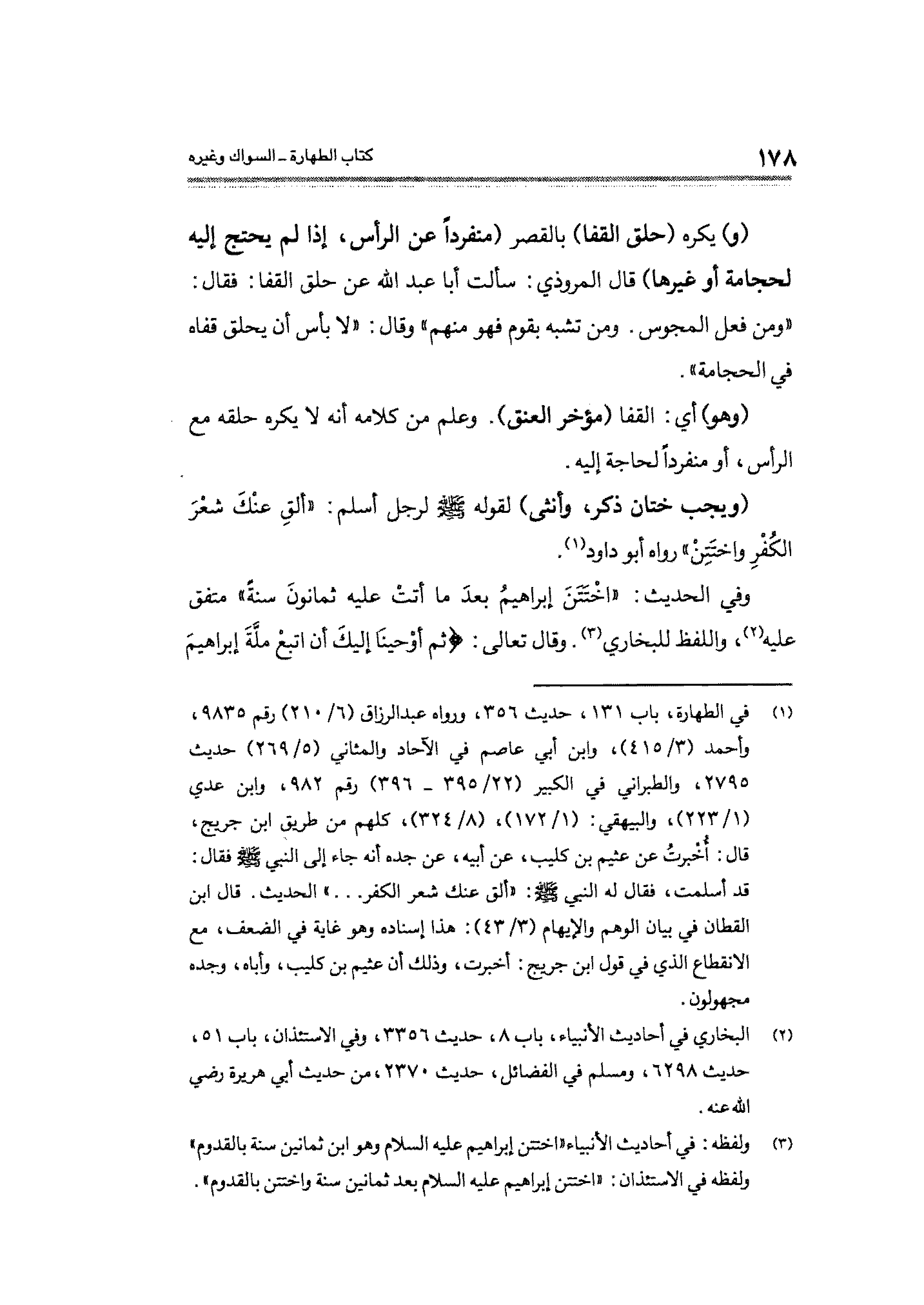 (¬١) في الطهارة، باب ١٣١، حديث ٣٥٦، ورواه عبد الرزاق (٦/ ٢١٠) رقم ٩٨٣٥، وأحمد (٣/ ٤١٥)، وابن أبي عاصم في الآحاد والمثاني (٥/ ٢٦٩) حديث ٢٧٩٥، والطبراني في الكبير (٢٢/ ٣٩٥ - ٣٩٦) رقم ٩٨٢، وابن عدي (١/ ٢٢٣)، والبيهقي: (١/ ١٧٢)، (٨/ ٣٢٤)، كلهم من طريق ابن جريج، قال: أُخْبرتُ عن عثيم بن كليب، عن أبيه، عن جده أنه جاء إلى النبي - صلى الله عليه وسلم - فقال: قد أسلمت، فقال له النبي - صلى الله عليه وسلم -: "ألق عنك شعر الكفر ... " الحديث. قال ابن القطان في بيان الوهم والإيهام (٣/ ٤٣): هذا إسناده وهو غاية في الضعف، مع الانقطاع الذي في قول ابن جريج: أخبرت، وذلك أن عثيم بن كليب، وأباه، وجده مجهولون.