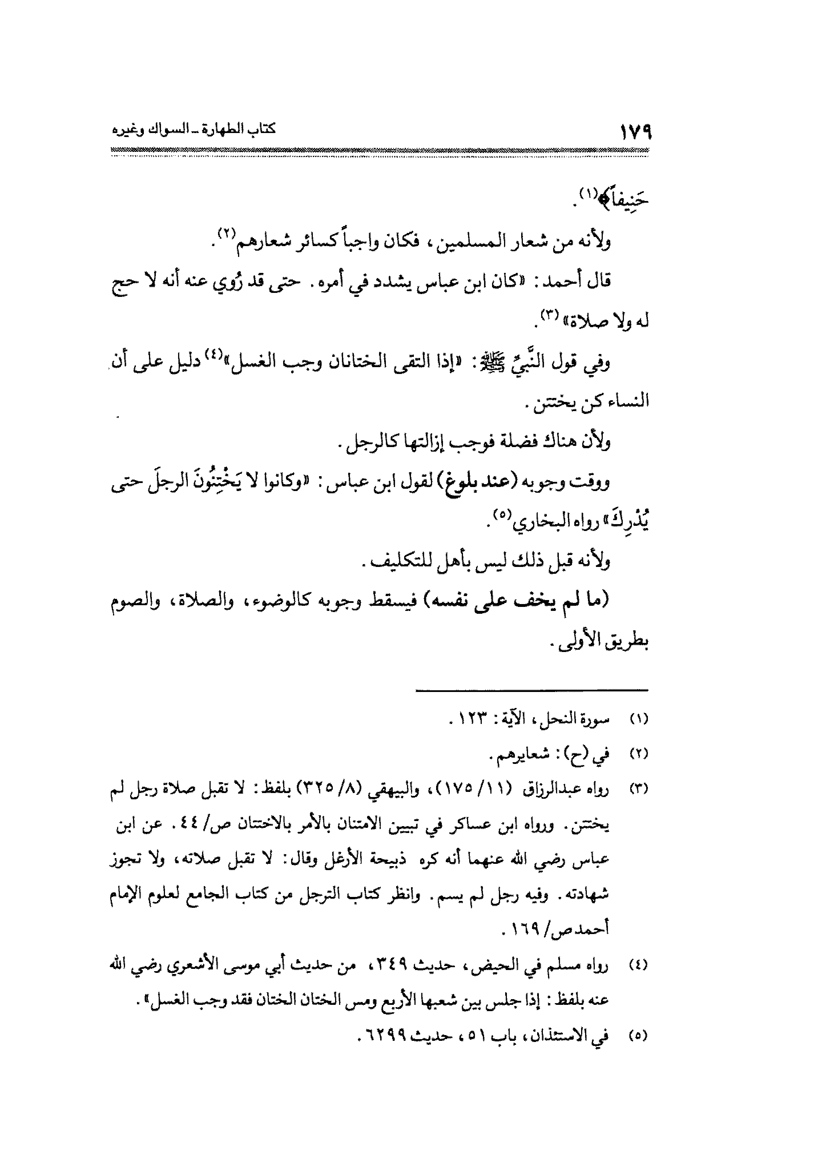 (¬٣) رواه عبد الرزاق (١١/ ١٧٥)، والبيهقي (٨/ ٣٢٥) بلفظ: لا تقبل صلاة رجل لم يختتن. ورواه ابن عساكر في تبيين الامتنان بالأمر بالاختتان ص / ٤٤. عن ابن عباس رضي الله عنهما أنه كره ذبيحة الأرغل وقال: لا تقبل صلاته، ولا تجوز شهادته. وفيه رجل لم يسم. وانظر كتاب الترجل من كتاب الجامع لعلوم الإمام أحمد ص / ١٦٩.