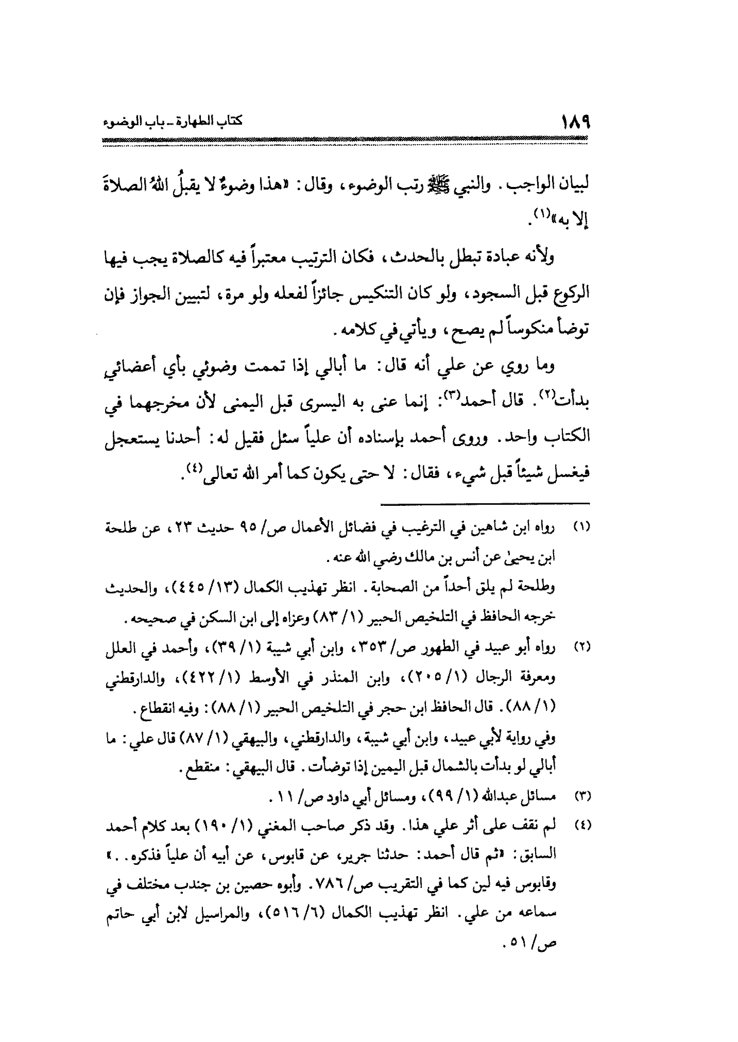 وما روي عن عليّ أنه قال: ما أبالي إذا تممت وضوئي بأي أعضائي بدأت (¬٢). قال أحمد (¬٣): إنَّما عنى به اليسرى قبل اليمنى لأنَّ مخرجهما في الكتاب واحد. وروى أحمد بإسناده أن عليًّا سئل فقيل له: أحدنا يستعجل فيغسل شيئًا قبل شيء، فقال: لا حتَّى يكون كما أمر الله تعالى (¬٤).